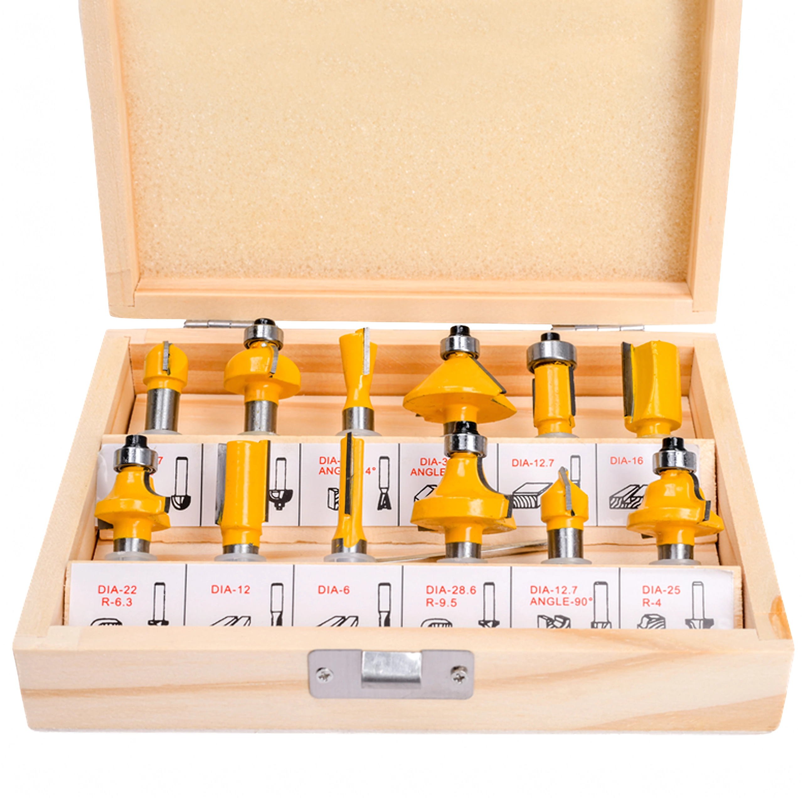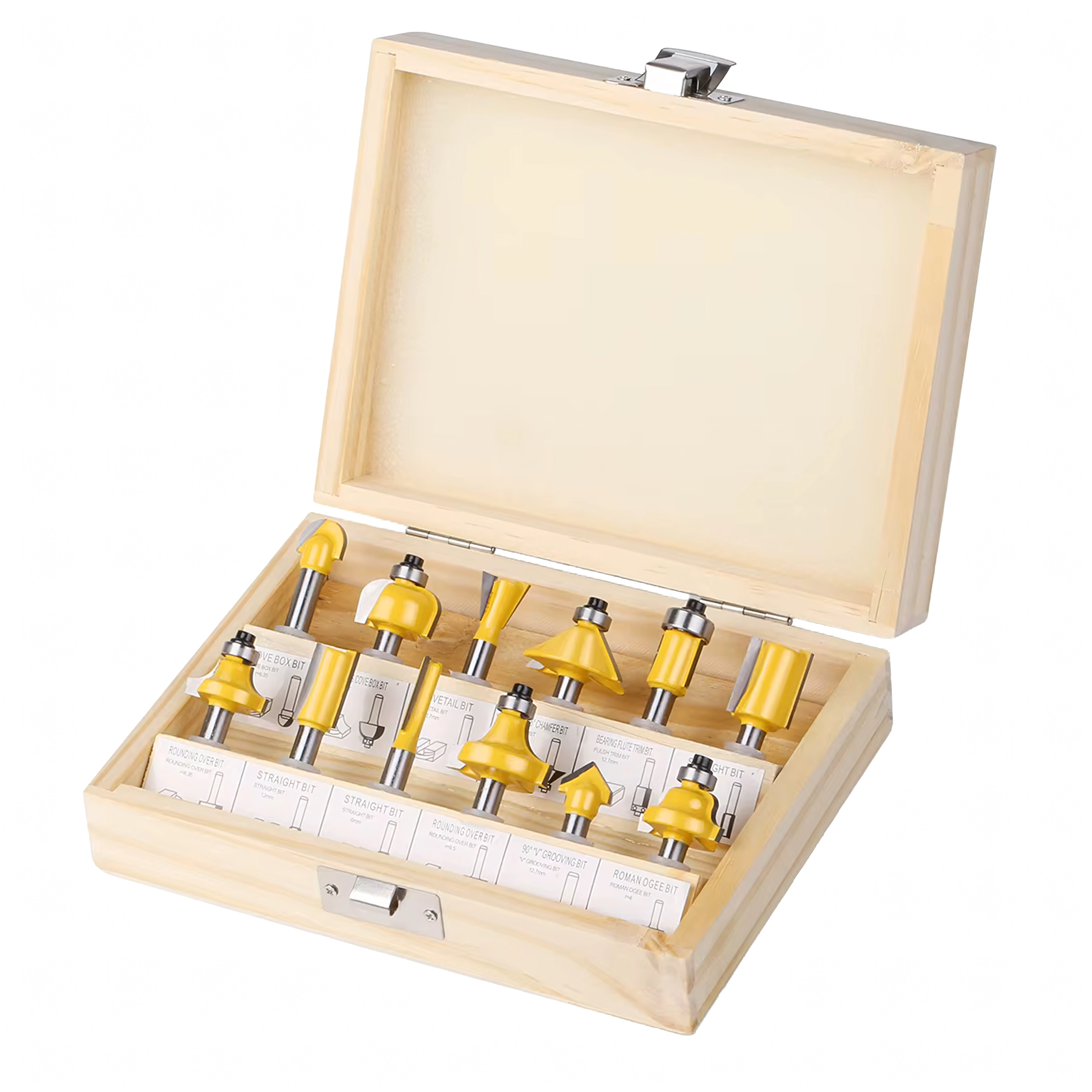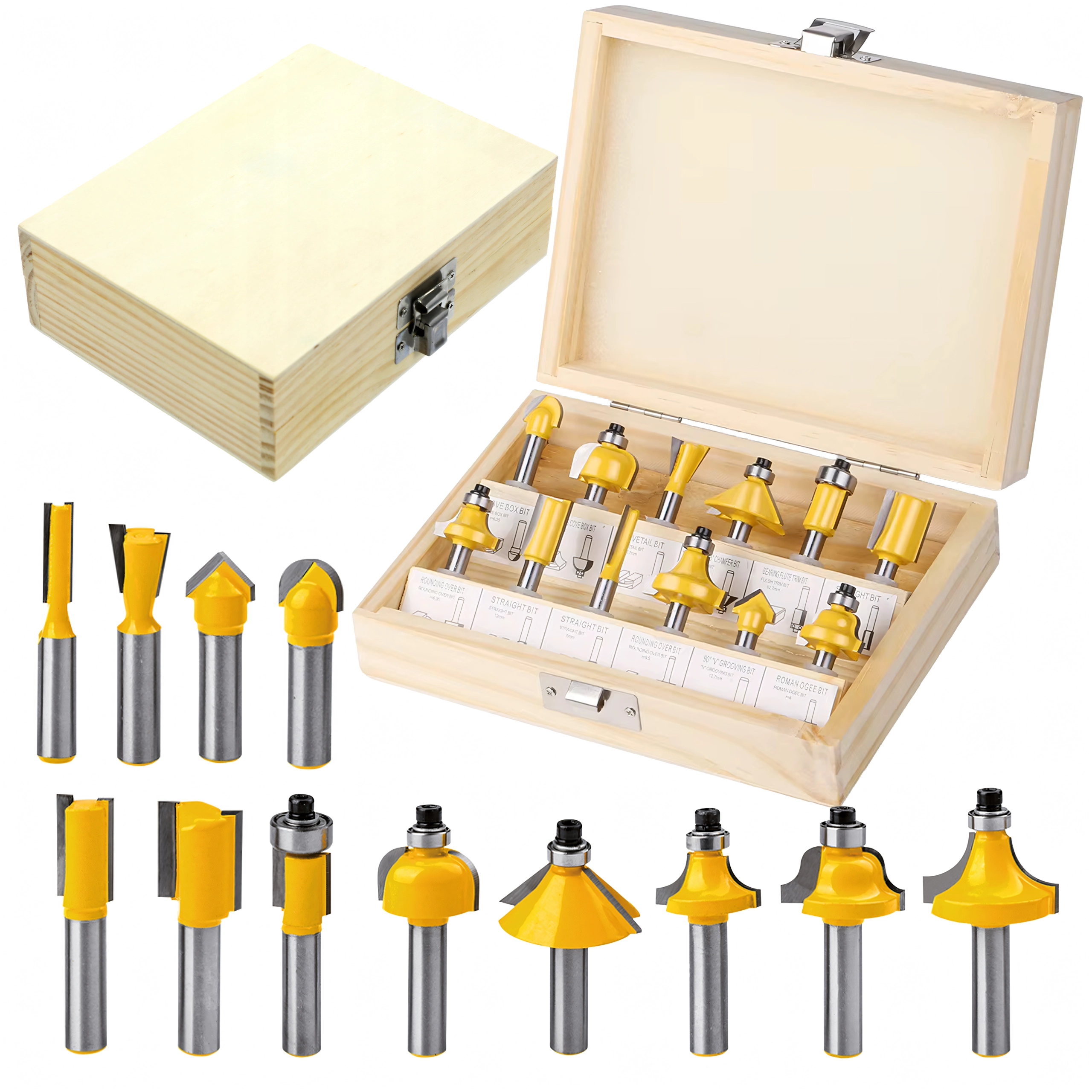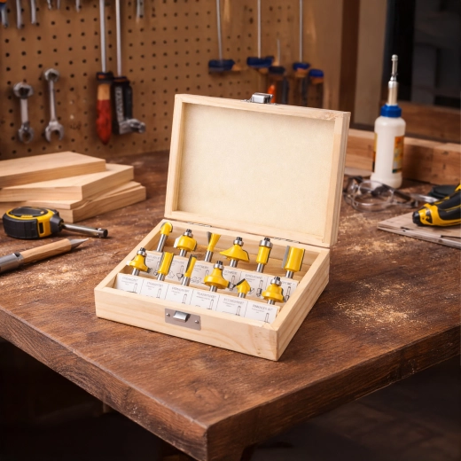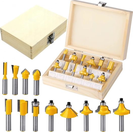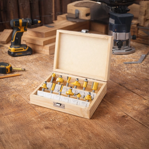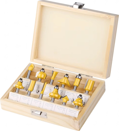 Każdy element jest umieszczony w wytrzymałej drewnianej walizce z przejrzystym układem, który chroni narzędzia podczas transportu i przyspiesza pracę w warsztacie. Zestaw pasuje do większości standardowych górnowrzecionowych frezarek z uchwytem 1/4".