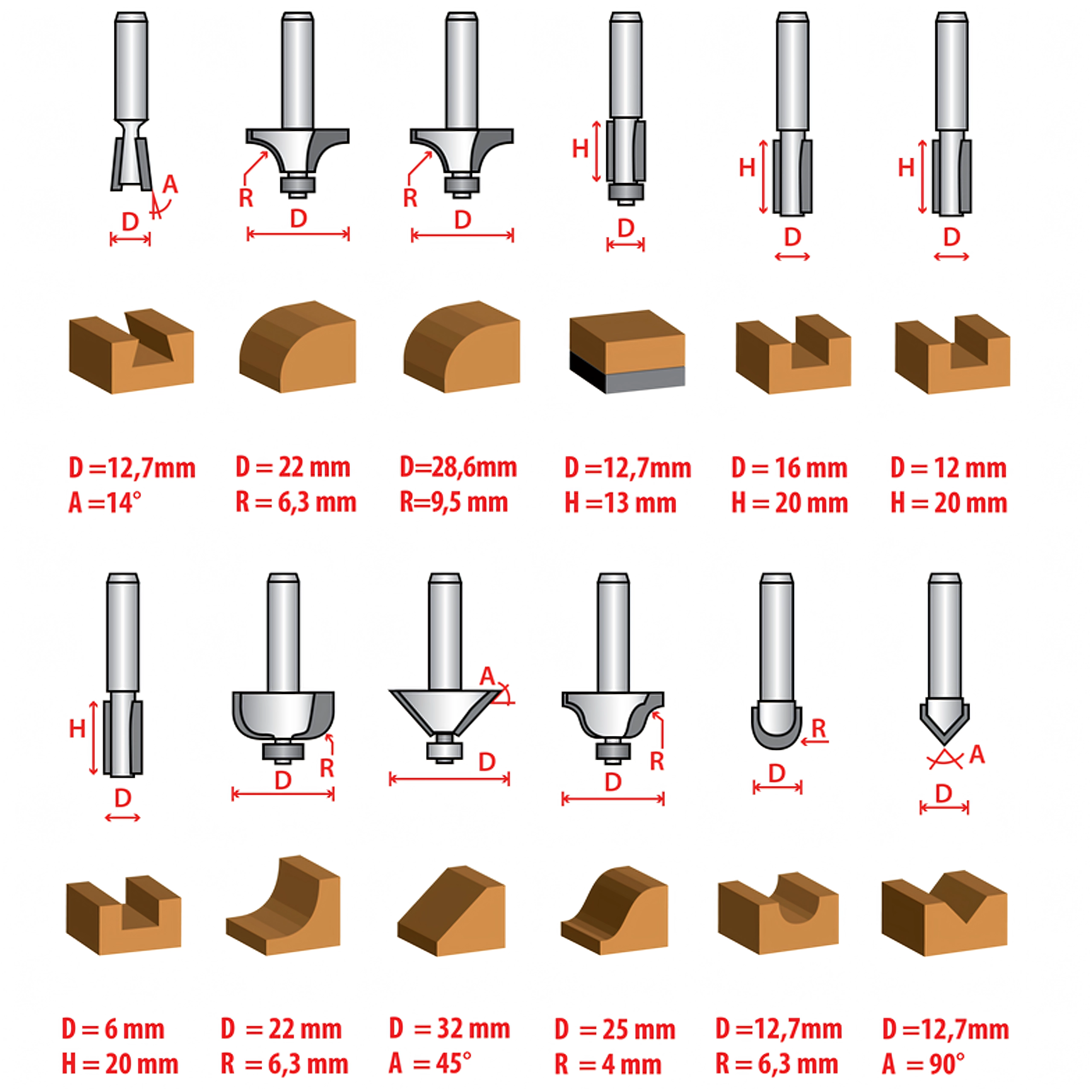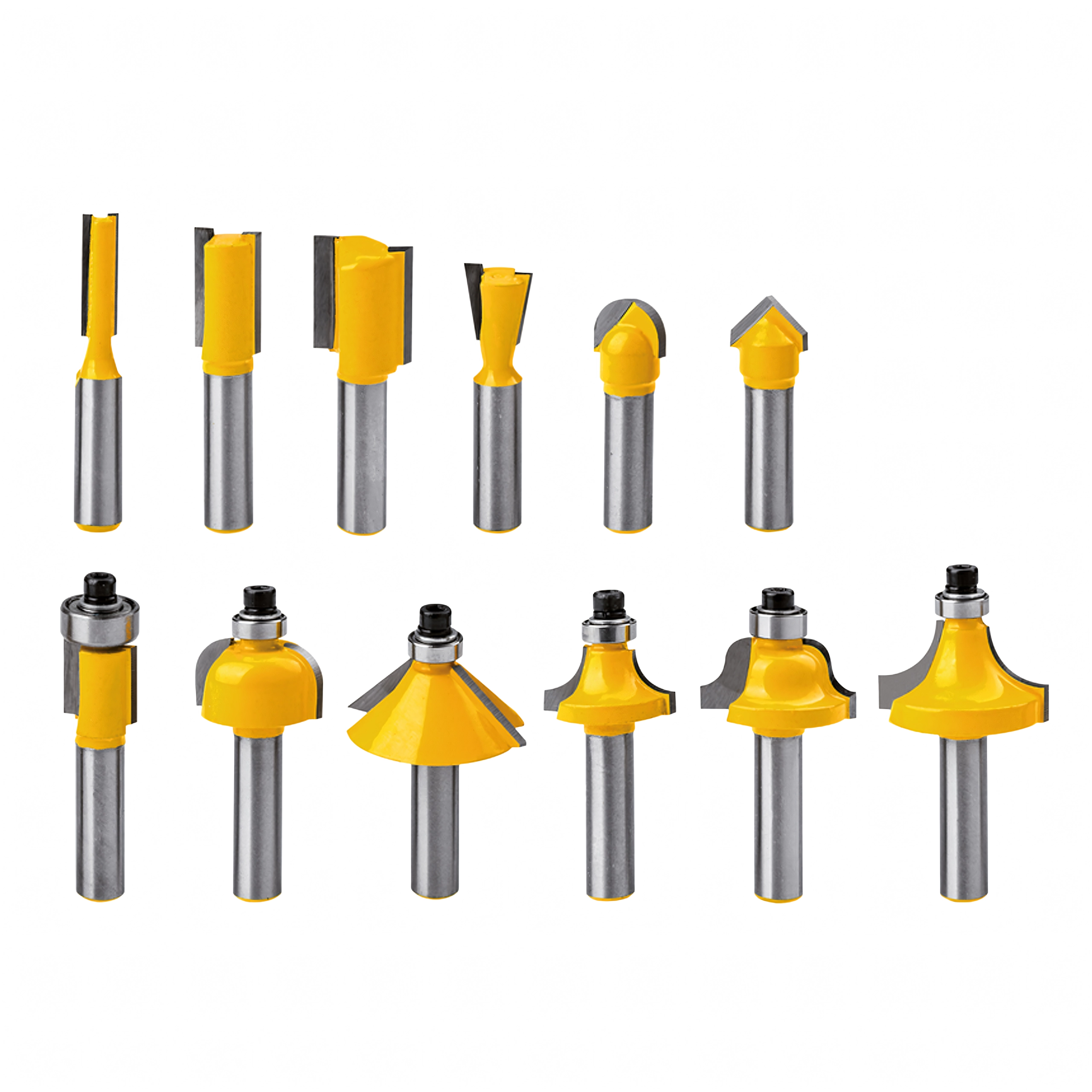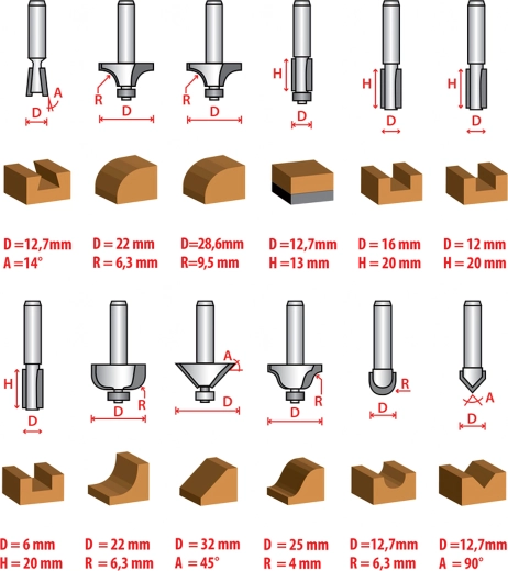 Ten kompaktowy zestaw 12 frezów profilowych z ostrzałami węglikowymi został zaprojektowany do czystych i powtarzalnych cięć. Zawiera najczęściej używane profile do zaokrąglania, fazowania krawędzi, rowków V oraz frezowania prostego, dzięki czemu łatwo wykończysz krawędzie elementów meblowych, ram i okładzin.