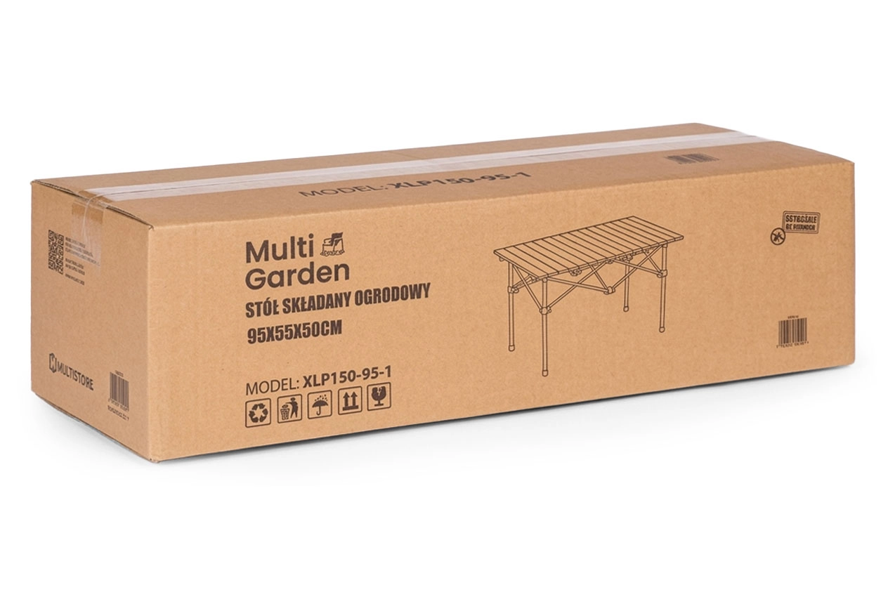 Stół ma roletowy blat z lameli, który tworzy stabilną powierzchnię do serwowania i przygotowywania. Solidna rama ze stali węglowej z krzyżowym wzmocnieniem zapewnia stabilność, a antypoślizgowe stopki pewnie trzymają się trawy, tarasu i podłoża ziemistego. Montaż jest intuicyjny i całkowicie beznarzędziowy – wystarczy rozłożyć ramę i zatrzasnąć blat za pomocą klipsów blokujących.