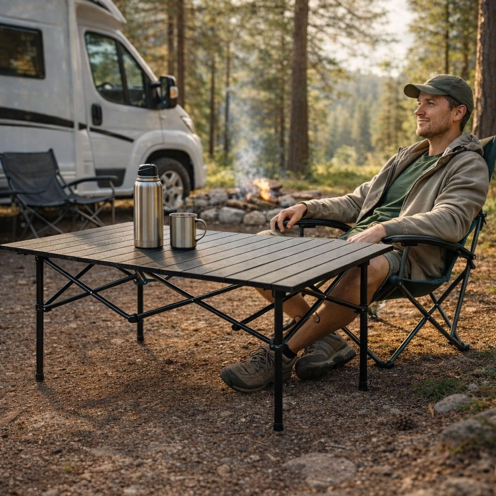 Wytrzymała konstrukcja z krzyżowym wzmocnieniem równomiernie rozkłada obciążenie i zapewnia pewność podczas serwowania oraz przygotowywania posiłków w terenie.