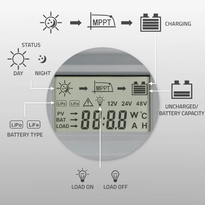 Wykorzystaj energię słońca w pełni dzięki inteligentnemu sterowaniu MPPT. Regulator na bieżąco śledzi punkt pracy paneli i maksymalizuje moc nawet przy zmiennych warunkach, takich jak częściowe zacienienie czy wahania natężenia światła. Czytelny wyświetlacz LCD oraz Bluetooth z aplikacją mobilną umożliwiają szybką konfigurację, zdalny nadzór i jasny podgląd aktualnych parametrów systemu.