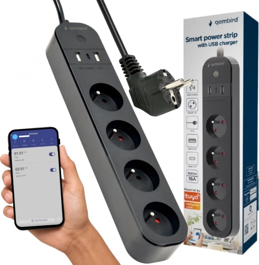 Inteligentna listwa zasilająca WiFi od Tuya oferuje 4 niezależnie sterowane gniazda 230 V, 2× USB‑A i 1× USB‑C do szybkiego ładowania oraz pomiar zużycia energii. Za pomocą aplikacji Smart Life / Tuya Smart włączysz i wyłączysz urządzenia zdalnie, ustawisz harmonogramy, automatyzacje oraz udostępnianie rodzinie – idealna do salonu, biura, kącika gamingowego i pokoju dziecięcego.