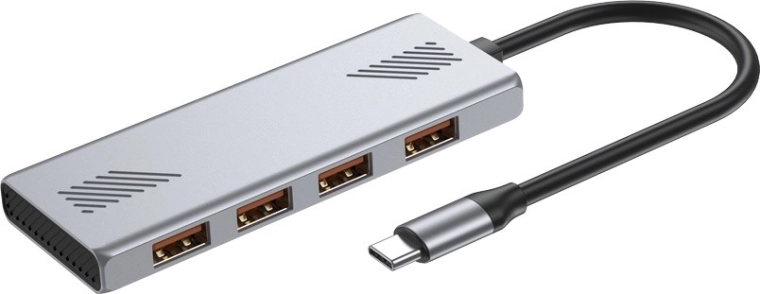 Kompaktowy hub USB-C z metalową obudową oferuje 4 porty USB‑A i prędkość transferu do 10 Gb/s dzięki standardowi USB 3.2 Gen 2. Idealny dla laptopów, komputerów PC i urządzeń z USB‑C/OTG, z wbudowanym kablem dla łatwego podłączenia oraz szeroką kompatybilnością z USB 3.x i 2.0.