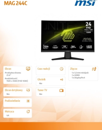 Ciesz się płynną rozgrywką i pracą na zakrzywionym monitorze MAG 244C o przekątnej 23,6", rozdzielczości Full HD i częstotliwości odświeżania 180 Hz. Dzięki technologii LED, nowoczesnemu zakrzywieniu dla lepszego zanurzenia oraz eleganckiemu czarnemu wykończeniu oferuje ostry obraz i wygodne oglądanie przez cały dzień.