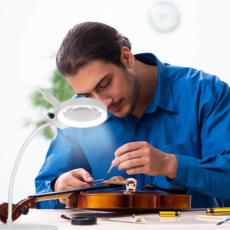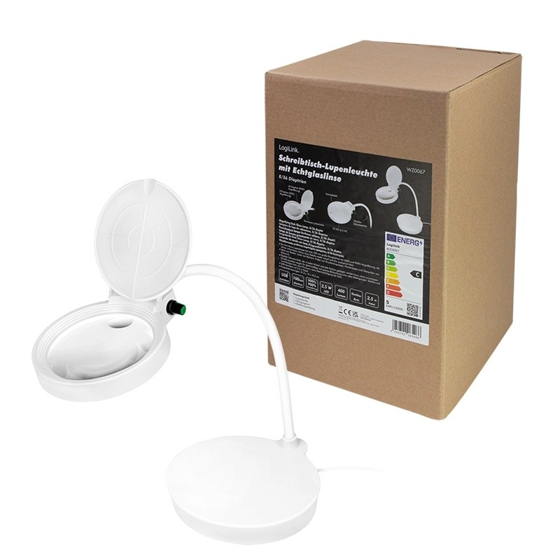 Solidna, dociążona podstawa zapewnia stabilność na biurku, a odchylana klapka chroni soczewkę przed kurzem i zarysowaniami. Kompaktowa konstrukcja z pierścieniem LED daje równomierne, nieoślepiające światło – idealne dla modelarzy, zegarmistrzów, do czytania drobnego druku czy napraw elektroniki.