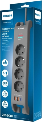 Listwa przeciwprzepięciowa PHILIPS zapewnia niezawodną ochronę wrażliwej elektroniki przed przepięciami i skokami napięcia. Dzięki pojemności 2400 J i technologii MOV pochłania nadmiar energii, zwiększając bezpieczeństwo podłączonych urządzeń. Cztery gniazda uzupełniają 3 porty USB (1× USB‑C, 2× USB‑A) do jednoczesnego ładowania wielu urządzeń.