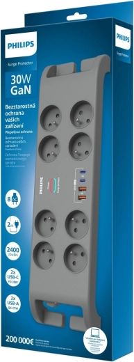 Chroń swoją elektronikę i ładuj wiele urządzeń jednocześnie dzięki listwie przeciwprzepięciowej PHILIPS z 8 zabezpieczonymi gniazdami, 4 portami USB (2× USB‑C + 2× USB‑A) oraz mocą 30 W GaN. Dzięki ochronie 2400 J, kontrolce ochrony i funkcji Power Blocker masz pewność bezpiecznego działania. Praktyczny przewód zasilający 2 m i zarządzanie okablowaniem zapewniają porządek i wygodę w domu oraz biurze.
