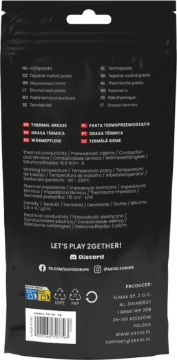 SAVIO GLACIER TG-05 to wysokowydajna pasta termoprzewodząca zaprojektowana dla graczy, twórców i overclockerów. Dzięki znakomitej przewodności cieplnej 18 W/m·K szybko odprowadza ciepło z CPU lub GPU do chłodzenia, obniżając temperatury, wydłużając żywotność komponentów i zwiększając stabilność przy wysokim obciążeniu.