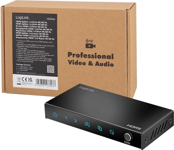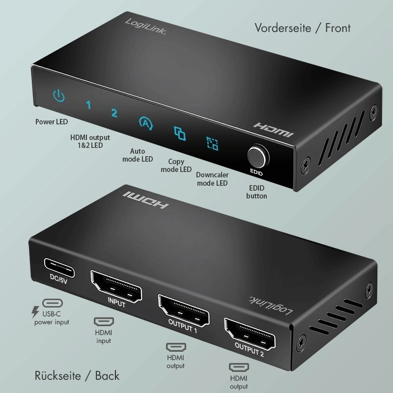 Praktyczne rozwiązanie dla biur, sklepów, witryn, poczekalni, restauracji oraz kina domowego. Rozdzielacz HDMI 1x2 umożliwia jednoczesne wyświetlanie prezentacji, wideo, gier i filmów na dwóch ekranach z maksymalną rozdzielczością 4K (3840 × 2160) przy 60 Hz. Dzięki funkcjom EDID i downscale można bezproblemowo łączyć wyświetlacze o różnych rozdzielczościach.
