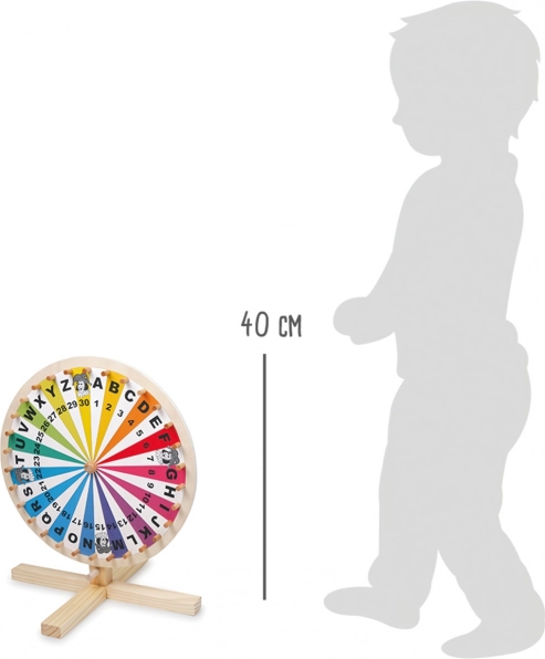 Drewniane koło fortuny small foot zamieni każdą aktywność w emocjonującą zabawę. Dzięki segmentom z literami A–Z, liczbami 1–30 oraz czterem jokerom doskonale sprawdzi się w grach słownych, loteriach, aktywnościach edukacyjnych i rodzinnych konkursach. Kolorowe wykonanie wspiera orientację i utrzymuje uwagę dzieci.