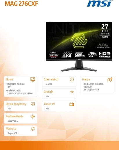 MSI MAG 276CXF został zaprojektowany dla graczy, którzy wymagają maksymalnej płynności i precyzji. Zakrzywiony panel wciąga w akcję, a wysoka częstotliwość odświeżania 280 Hz i niski czas reakcji zapewniają perfekcyjnie ostry obraz nawet przy szybkim ruchu. Stylowe, cienkie ramki i stabilna podstawa w kształcie V pasują do każdego gamingowego stanowiska.