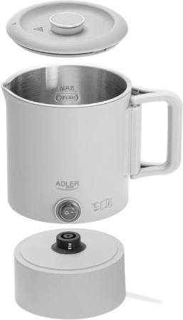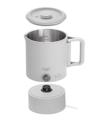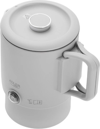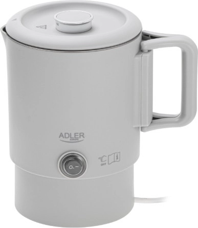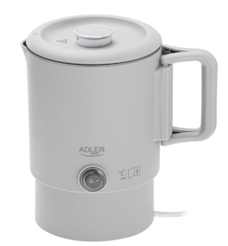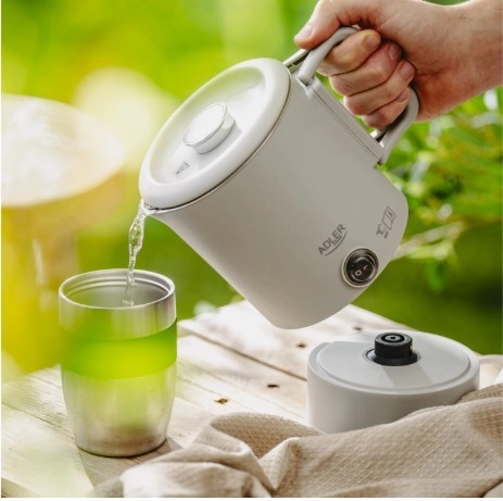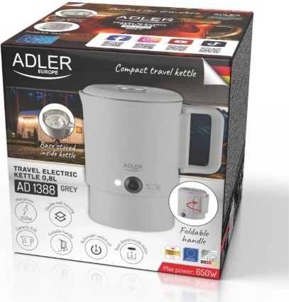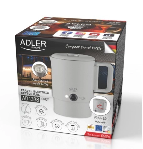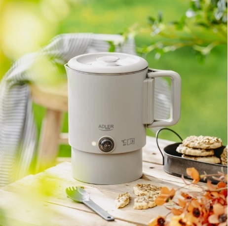 Kompaktowy podróżny czajnik ADLER AD 1388 o pojemności 0,8 l jest idealny na wakacje, wyjazdy służbowe i kemping. Dzięki składanej rączce, możliwości schowania podstawy wewnątrz czajnika oraz podwójnej ściance łączy minimalne wymiary z bezpiecznym i szybkim gotowaniem wody. Wewnętrzny korpus ze stali nierdzewnej, automatyczne wyłączanie, zabezpieczenie przed pracą na sucho oraz obrotowa podstawa 360° czynią go praktycznym towarzyszem każdej podróży.