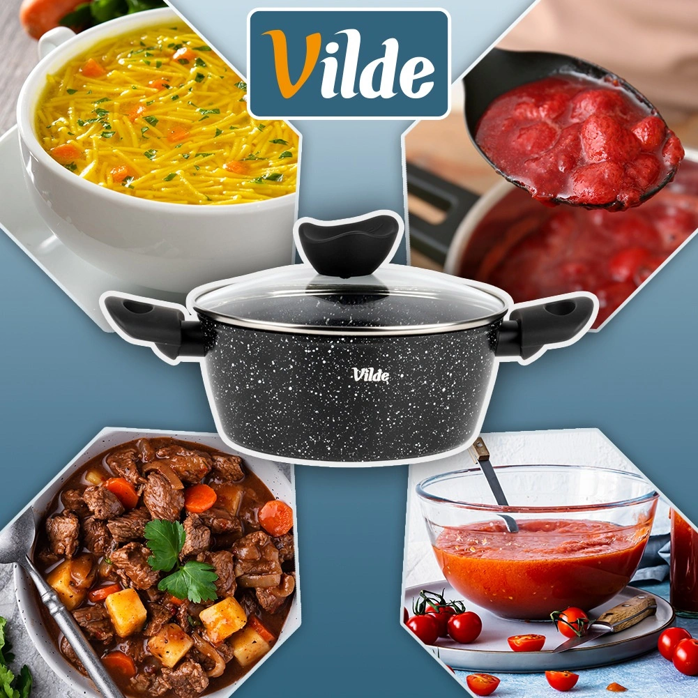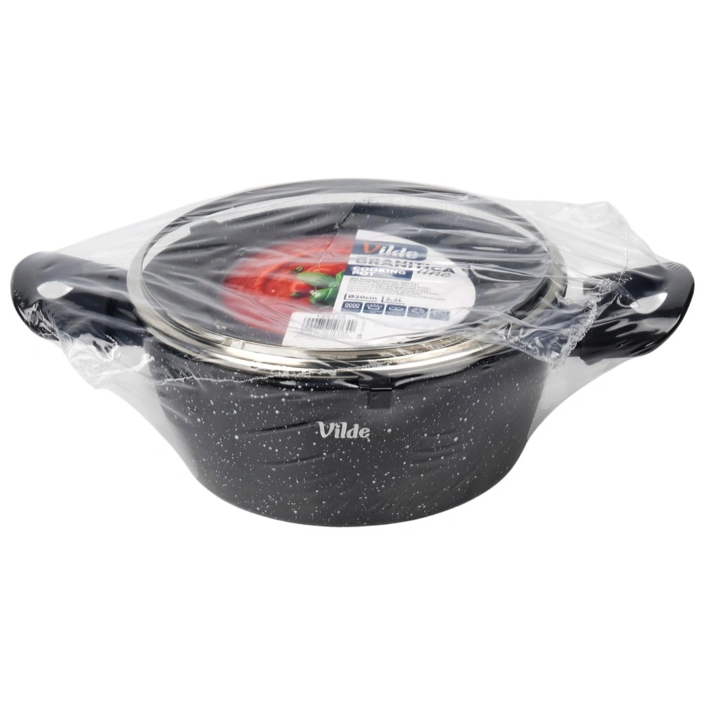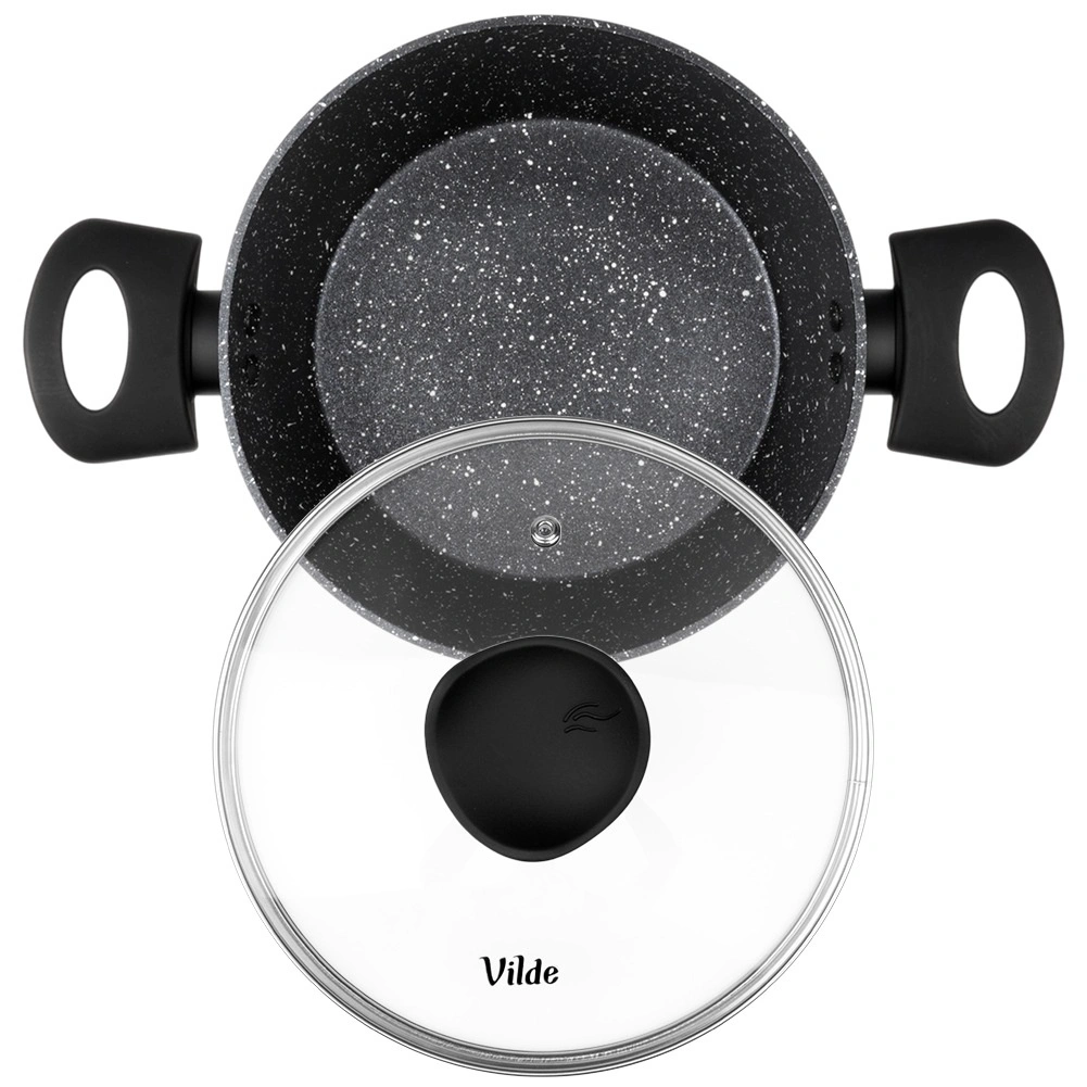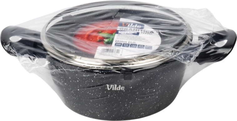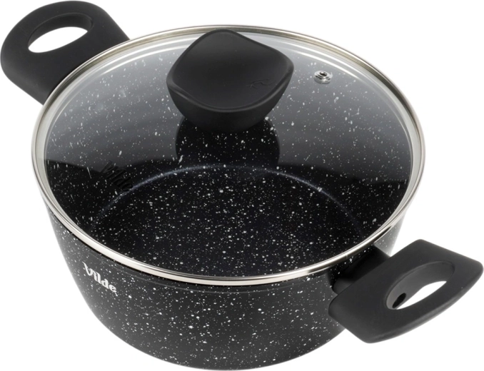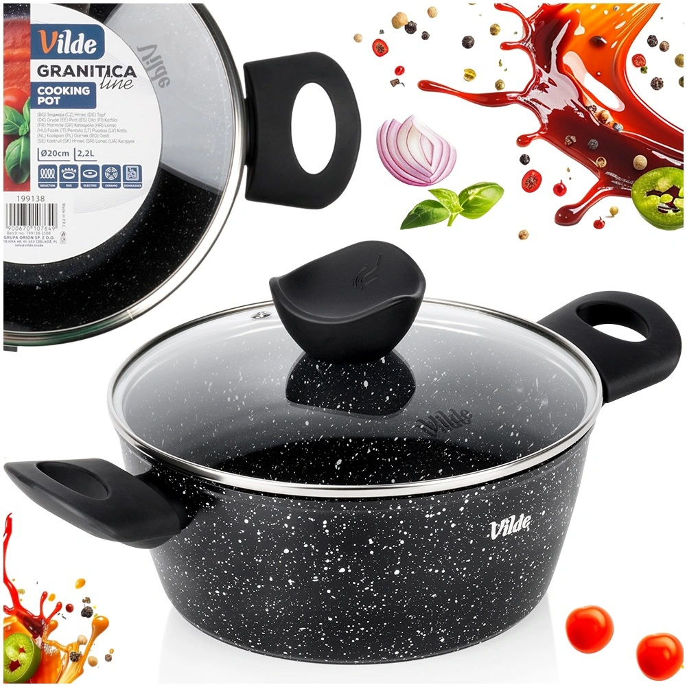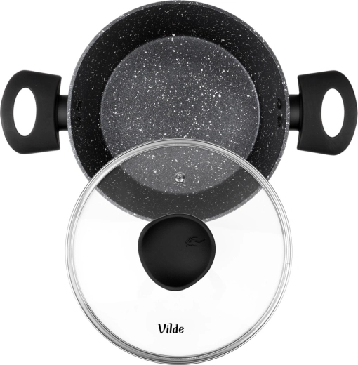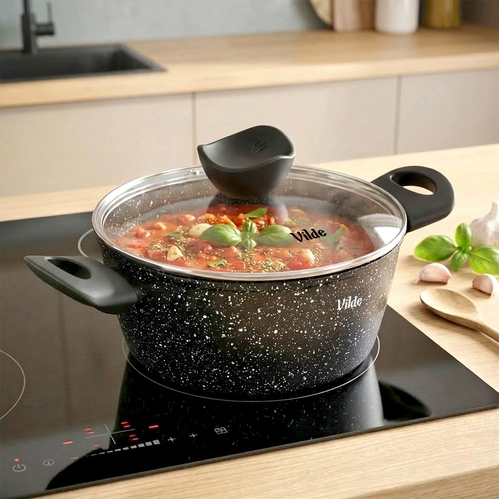 VILDE Granitica Line łączy trwałość i wygodę. Nieprzywierająca granitowa powłoka zapobiega przypalaniu, szklana pokrywka z zaworem pary ułatwia kontrolę gotowania, a ergonomiczne uchwyty z wykończeniem soft touch zwiększają bezpieczeństwo i komfort podczas użytkowania.