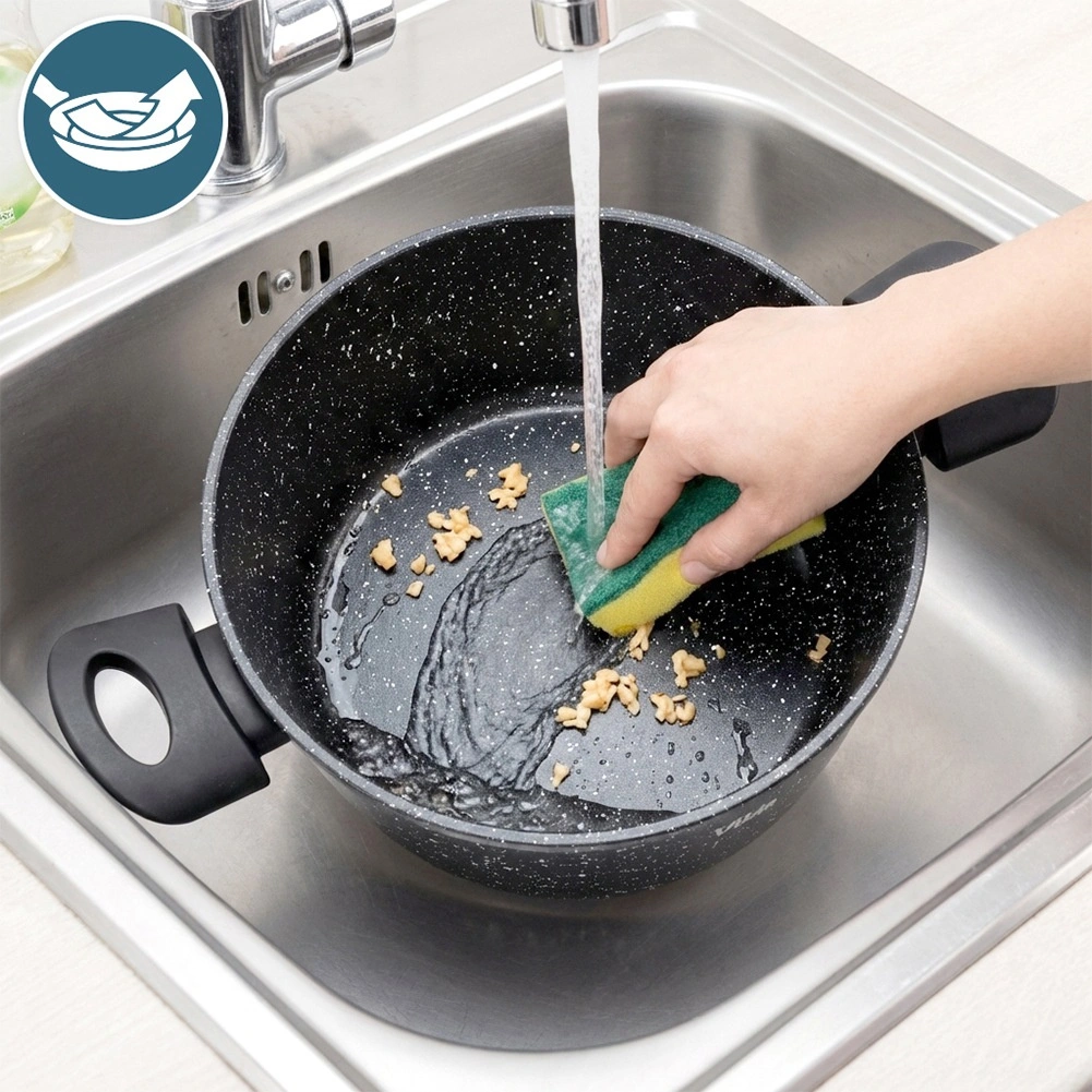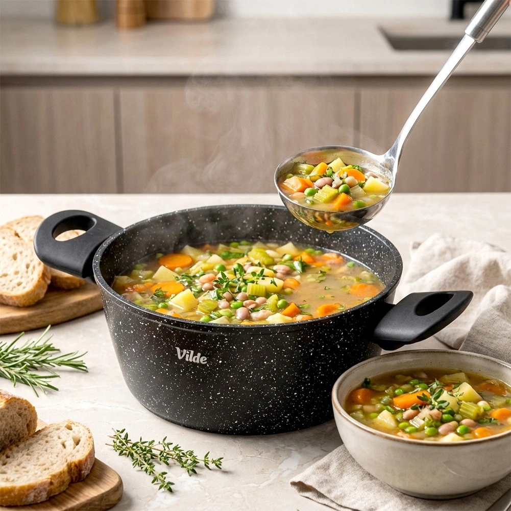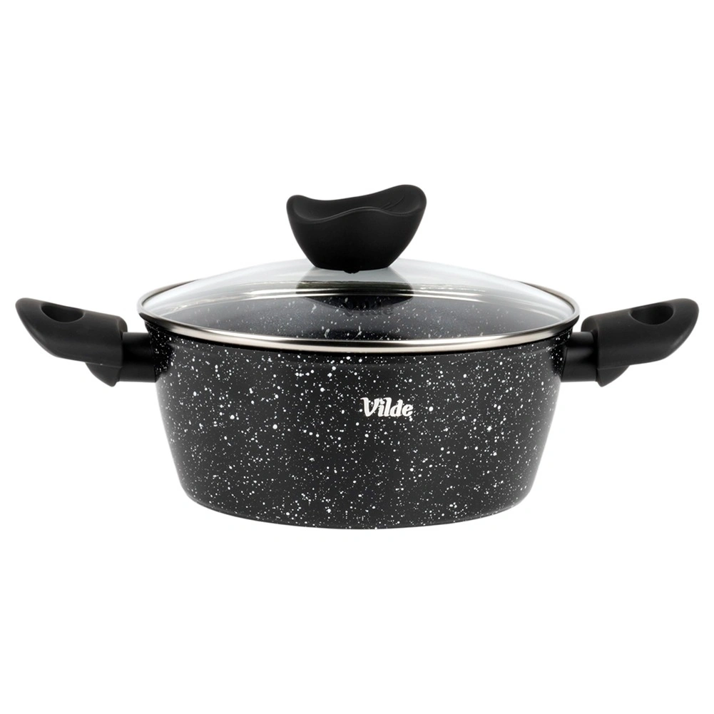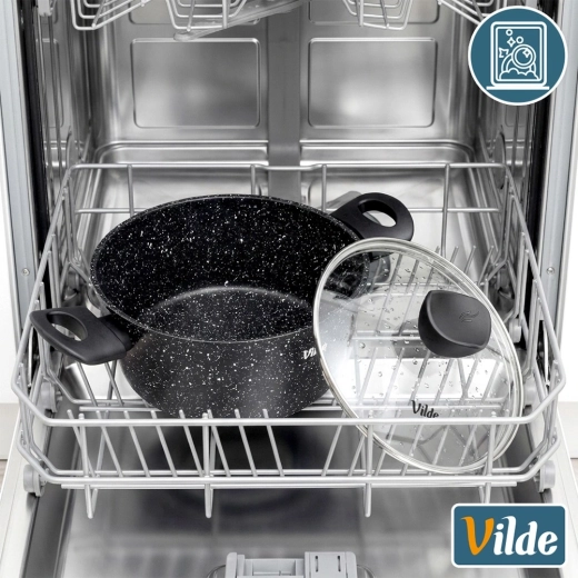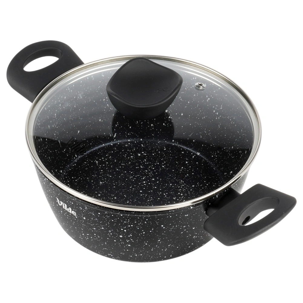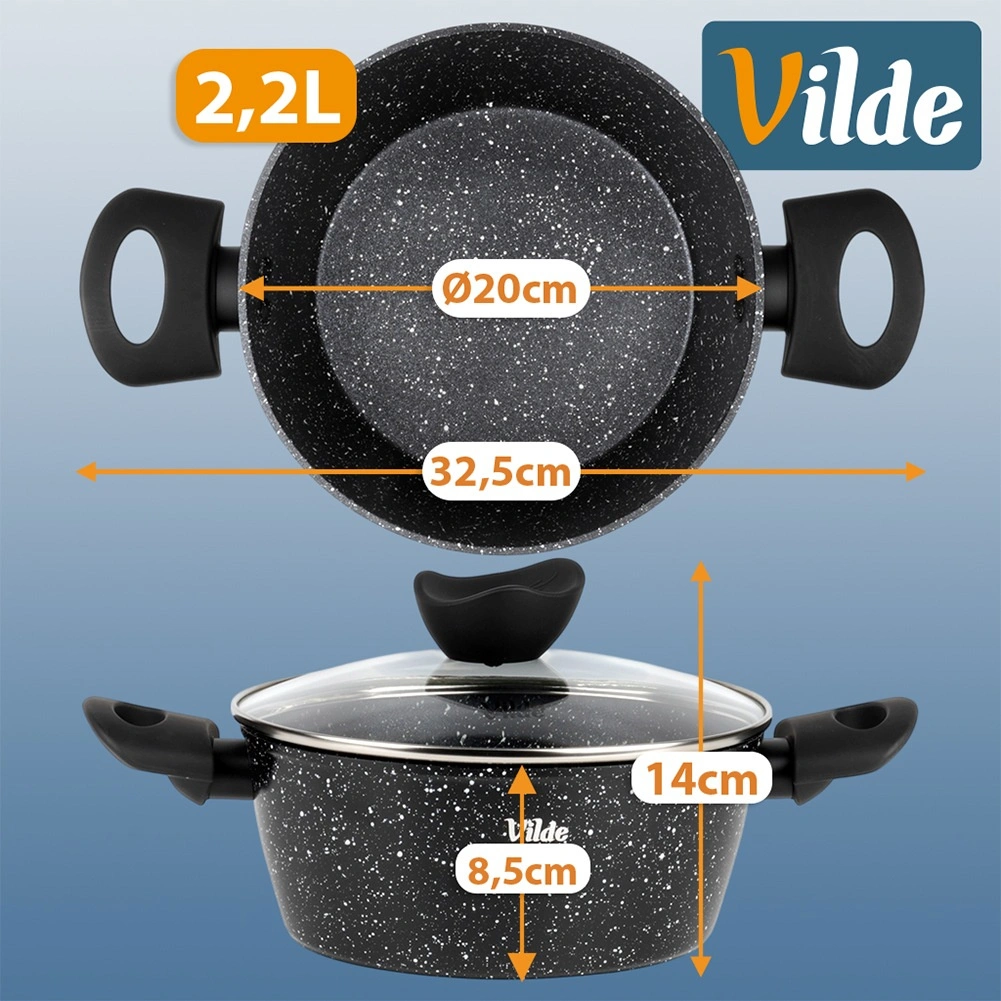 VILDE Granitica Line łączy trwałość i wygodę. Nieprzywierająca granitowa powłoka zapobiega przypalaniu, szklana pokrywka z zaworem pary ułatwia kontrolę gotowania, a ergonomiczne uchwyty z wykończeniem soft touch zwiększają bezpieczeństwo i komfort podczas użytkowania.