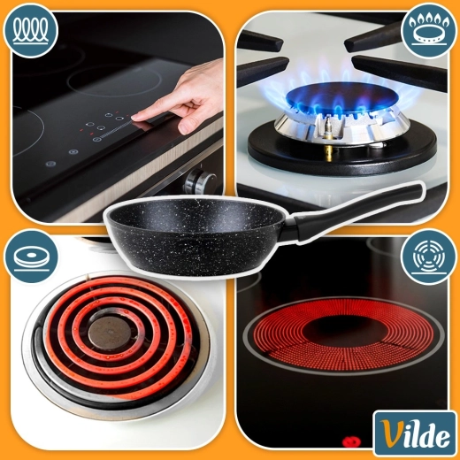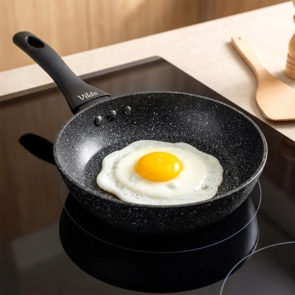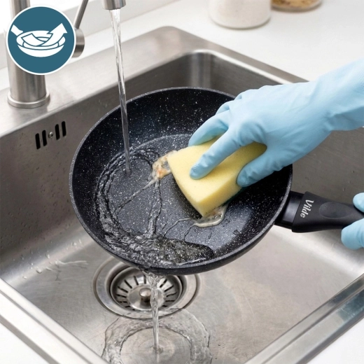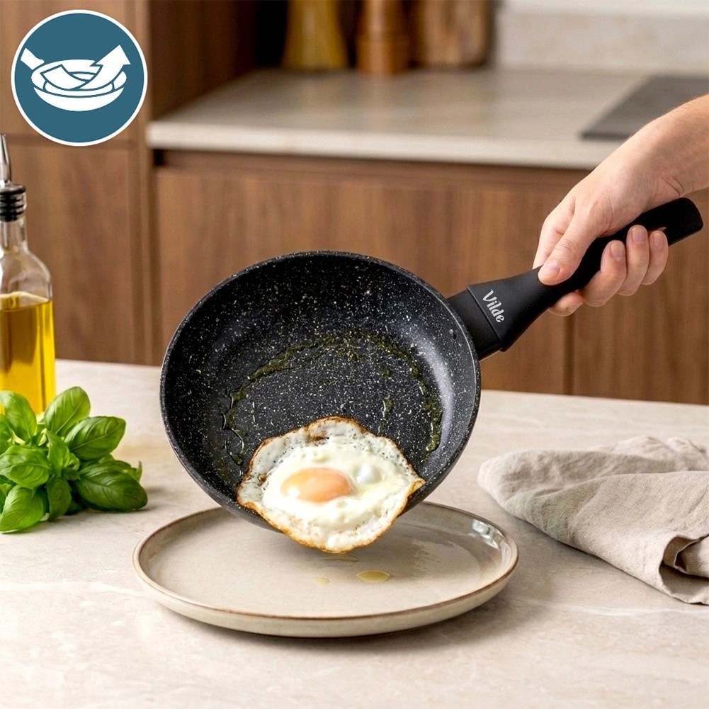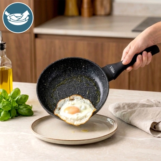 Wytrzymała kamienna powierzchnia minimalizuje przypalanie, pozwala gotować z mniejszą ilością oleju i wyraźnie ułatwia czyszczenie.