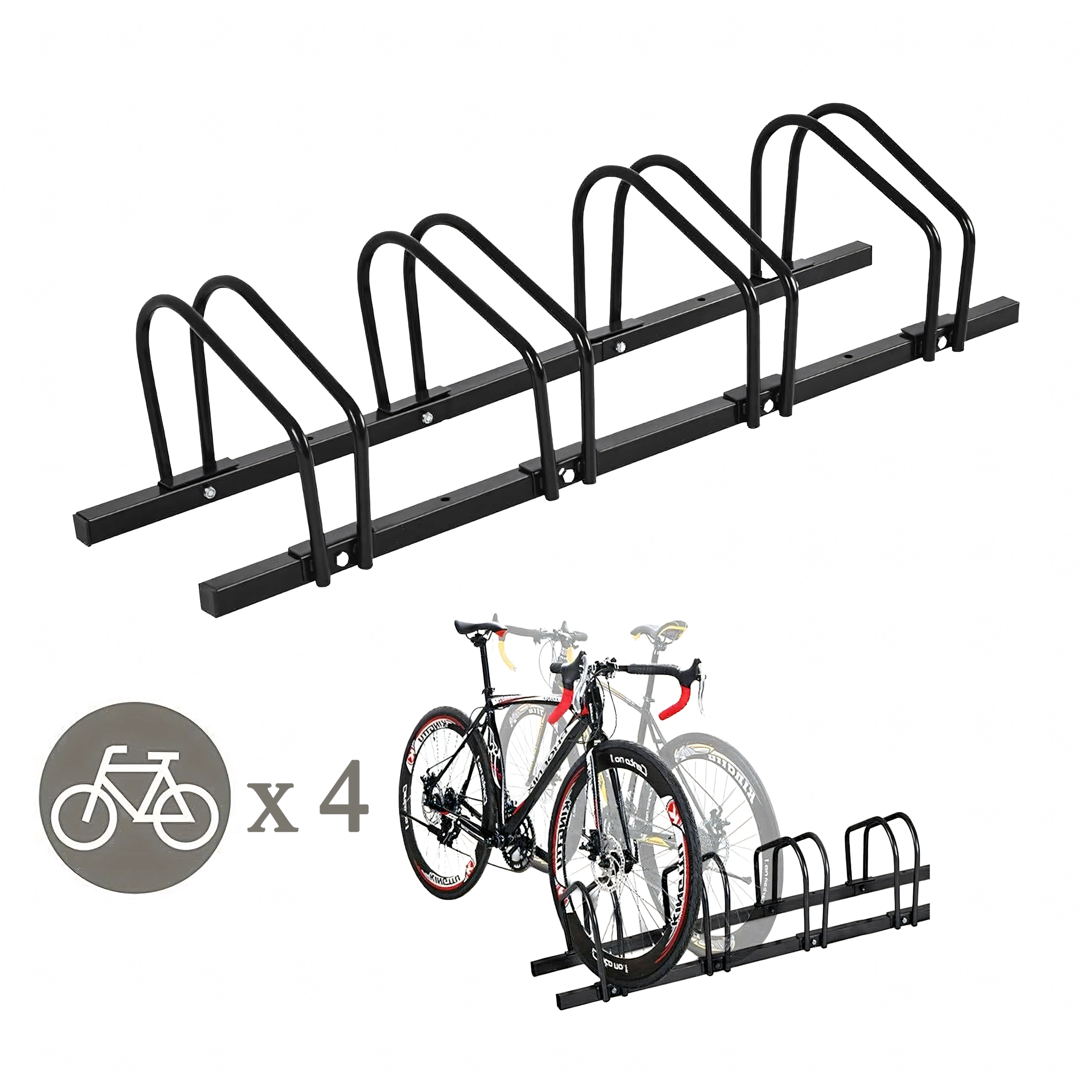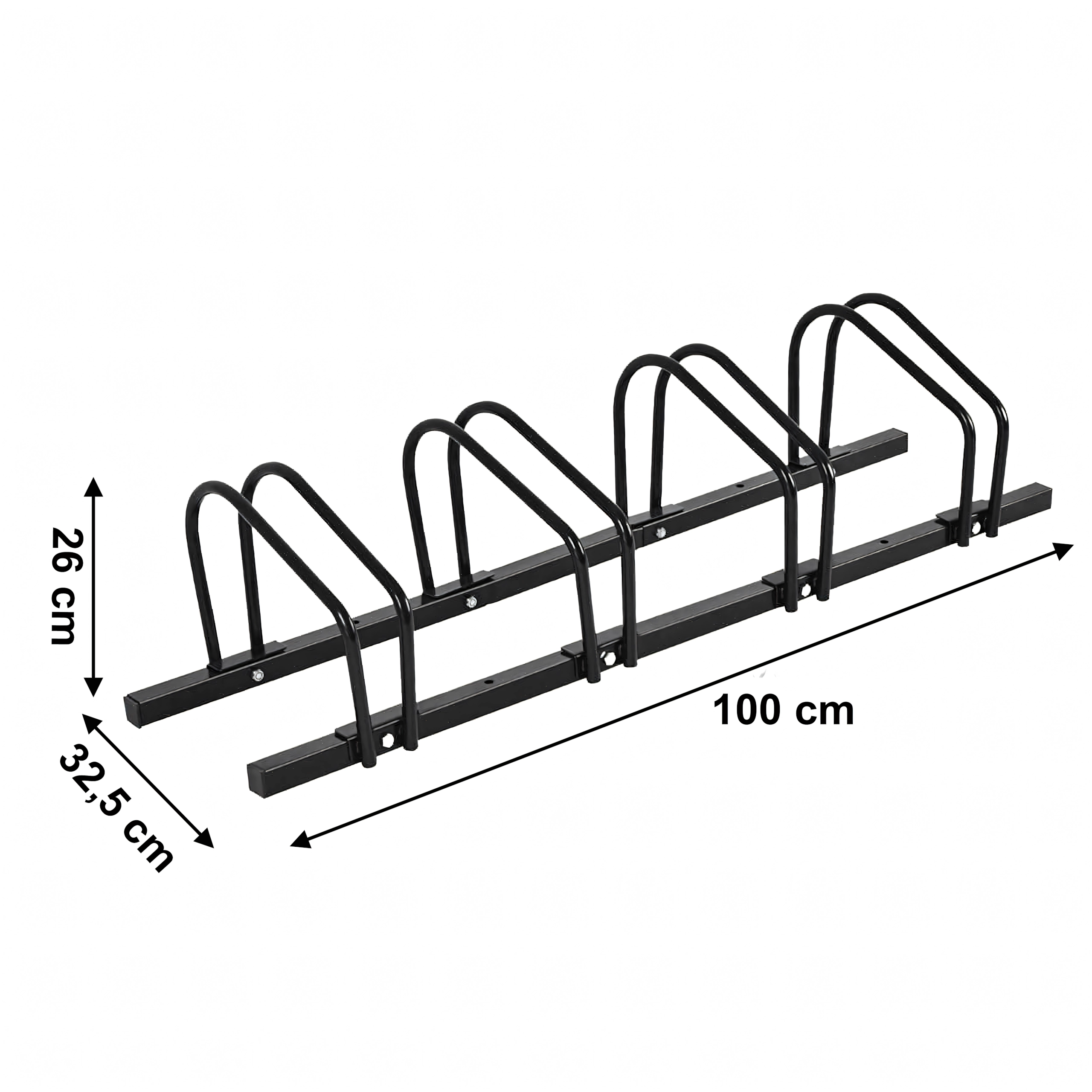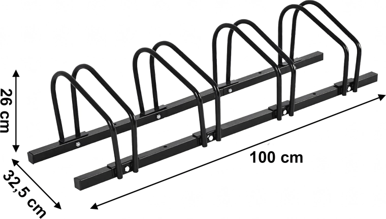 Ten solidny stojak na rowery mieści do czterech rowerów i utrzymuje je bezpiecznie w pozycji pionowej. Stalowa konstrukcja z odporną powłoką zapewnia długą żywotność i stabilność podczas codziennego użytkowania. Dzięki kompaktowym wymiarom 100 × 32,5 × 26 cm nadaje się do garażu, piwnicy, na taras oraz do punktów usługowych.