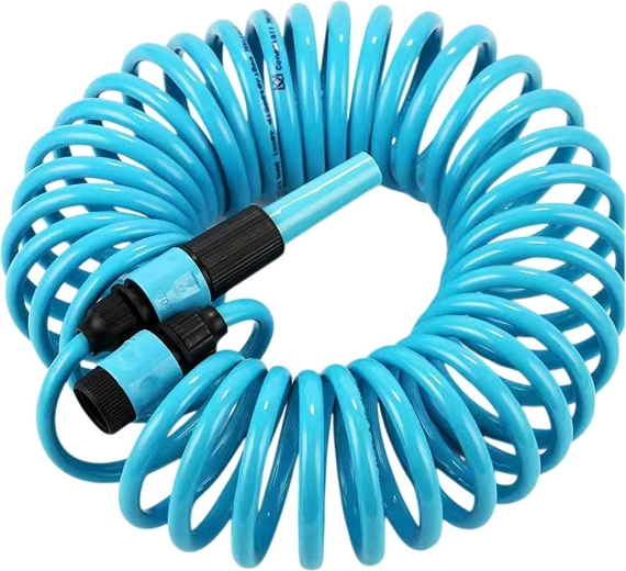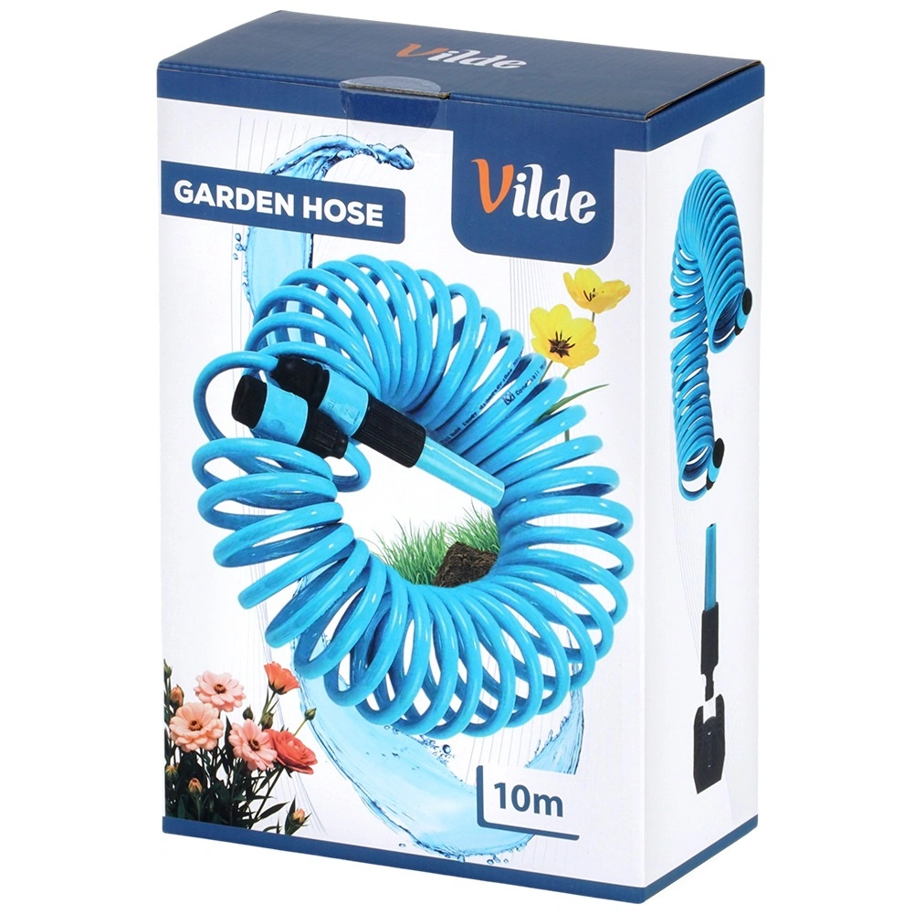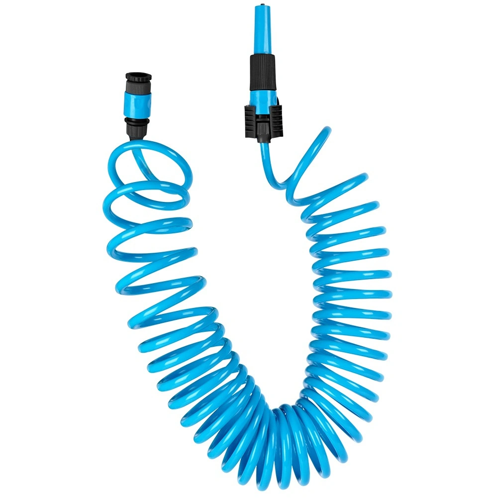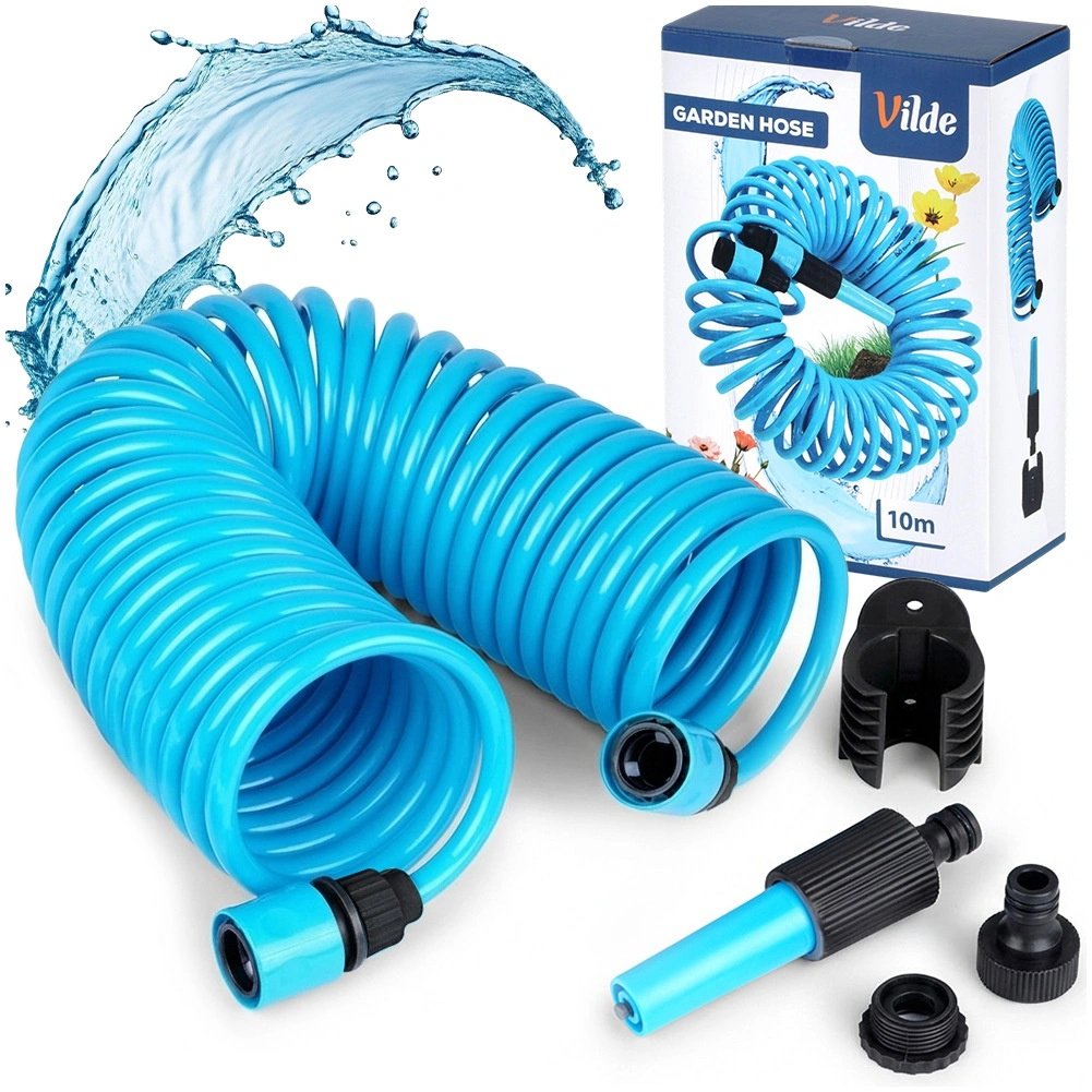 Praktyczny spiralny wąż ogrodowy o długości 10 m z samonawijającą się konstrukcją oszczędza miejsce i ułatwia pracę. W zestawie znajduje się pistolet zraszający, szybkozłączki oraz uchwyt ścienny. Wąż jest lekko elastyczny, wytrzymały i po zwolnieniu automatycznie się zwija, dzięki czemu nie plącze się i nie wymaga ręcznego zwijania.