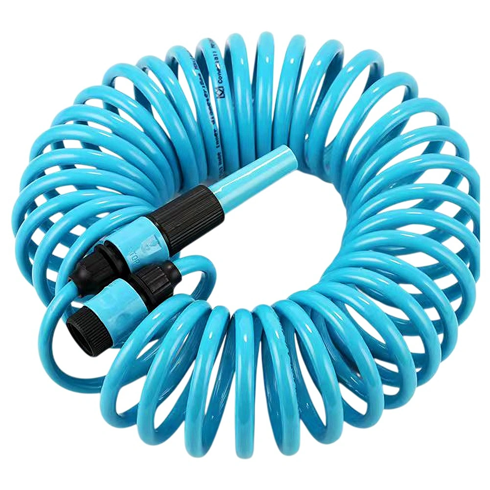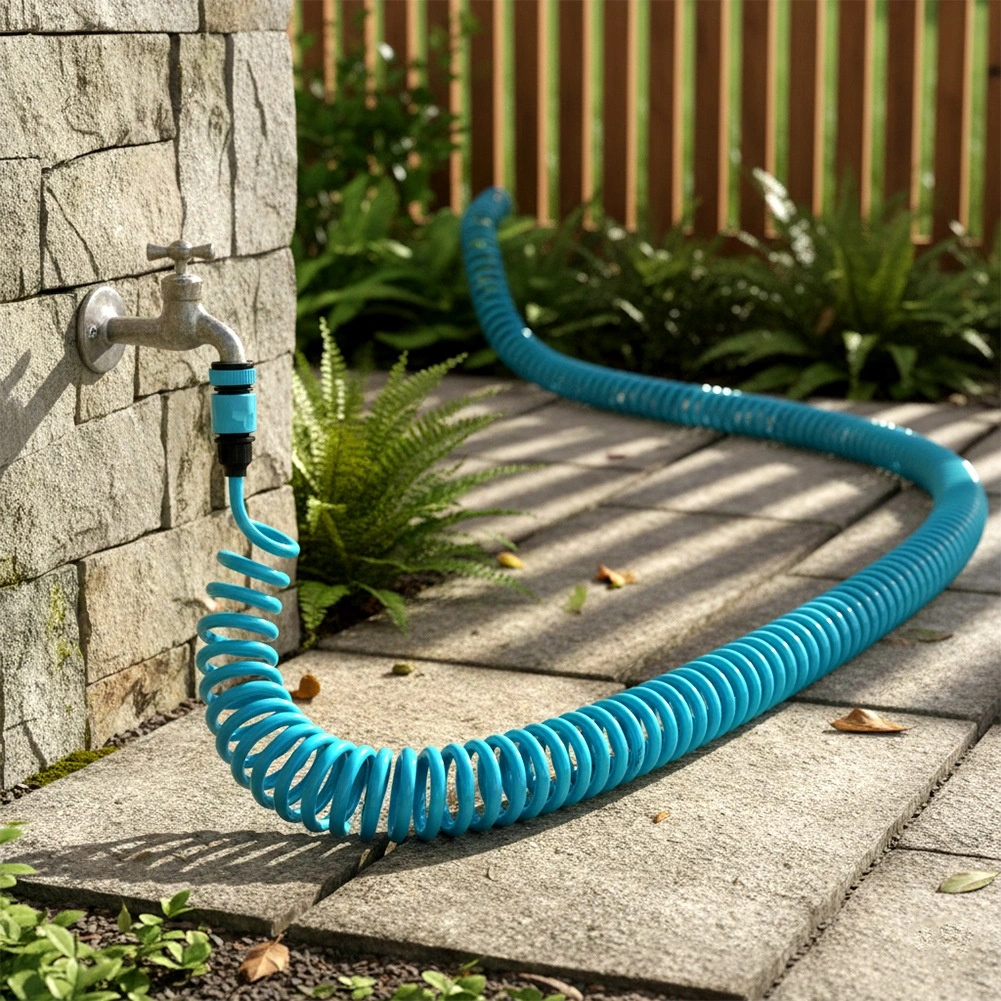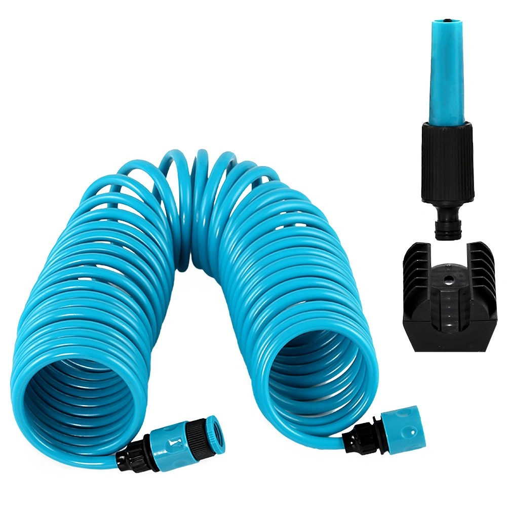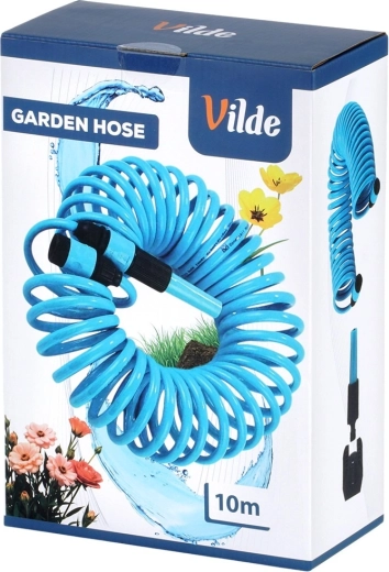 Praktyczny spiralny wąż ogrodowy o długości 10 m z samonawijającą się konstrukcją oszczędza miejsce i ułatwia pracę. W zestawie znajduje się pistolet zraszający, szybkozłączki oraz uchwyt ścienny. Wąż jest lekko elastyczny, wytrzymały i po zwolnieniu automatycznie się zwija, dzięki czemu nie plącze się i nie wymaga ręcznego zwijania.