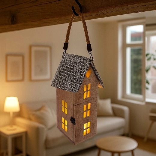 Praktyczny, odłączany uchwyt linowy ułatwia przenoszenie i zawieszanie. Lampion możesz ustawić na komodzie, półce czy parapecie okiennym lub powiesić, by uzyskać jeszcze bardziej wyraziste efekty świetlne prześwitujące przez okienka domku. Idealny jako całoroczna dekoracja i sezonowy akcent na święta czy wieczorne spotkania.