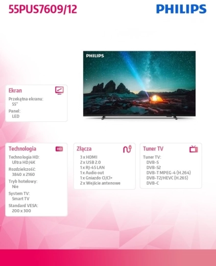 Ciesz się wielką rozrywką na telewizorze o przekątnej 55" i ostrym rozdzielczości 4K UHD. Oferuje płynny obraz, nowoczesne inteligentne funkcje i proste sterowanie. Świetny stosunek ceny do wydajności do kina domowego i codziennego oglądania. 55" 4K UHD, panel LED, Smart TV, płynny obraz i czysty dźwięk dla Twoich ulubionych filmów, seriali i sportu.