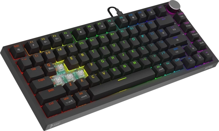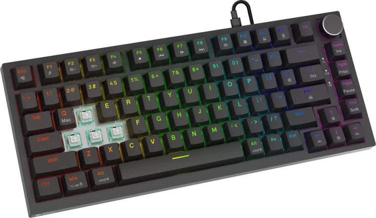 Kompaktowy układ 82 klawiszy oszczędza miejsce dla myszy bez utraty kluczowych funkcji. Dzięki pełnemu N-key rollover i anti-ghostingowi każdy nacisk zostaje zarejestrowany dokładnie tak, jak potrzebujesz – nawet przy najszybszych kombinacjach. Programowalne RGB pozwala tworzyć efekty, profile i makra w oprogramowaniu, a nakładki PBT opierają się zużyciu i nie ślizgają się.