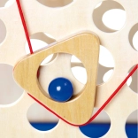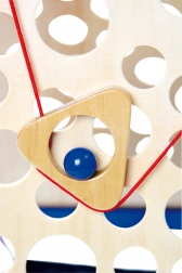 Materiałowy kosz między ścianami wyłapuje spadające kulki, więc nic nie ucieknie. Płynne prowadzenie sznureczków jest łatwe dla dzieci i wspiera cierpliwość.