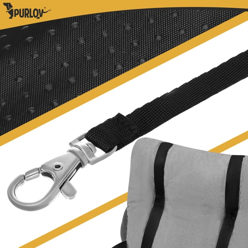 Szary fotelik-legowisko do auta PURLOV łączy bezpieczeństwo, komfort i łatwą instalację. Wysokie, wyściełane ścianki dają pupilowi poczucie pewności, a wodoodporny i antypoślizgowy spód utrzymuje fotelik stabilnie na miejscu. Wewnętrzny pas do przypięcia szelek pomaga ograniczyć ruch podczas hamowania i na zakrętach.