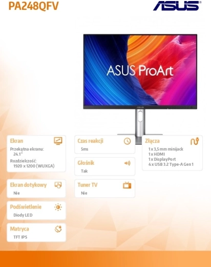 Profesjonalny monitor 24,1" ASUS ProArt PA248QFV oferuje wierne kolory, rozdzielczość WUXGA (1920 × 1200) w formacie 16:10, płynne odświeżanie 100 Hz oraz wysokiej jakości panel IPS. Dzięki bogatej łączności HDMI i DisplayPort, ergonomicznemu stojakowi oraz fabrycznej kalibracji kolorów jest idealny dla grafików, fotografów i wymagających użytkowników biurowych.