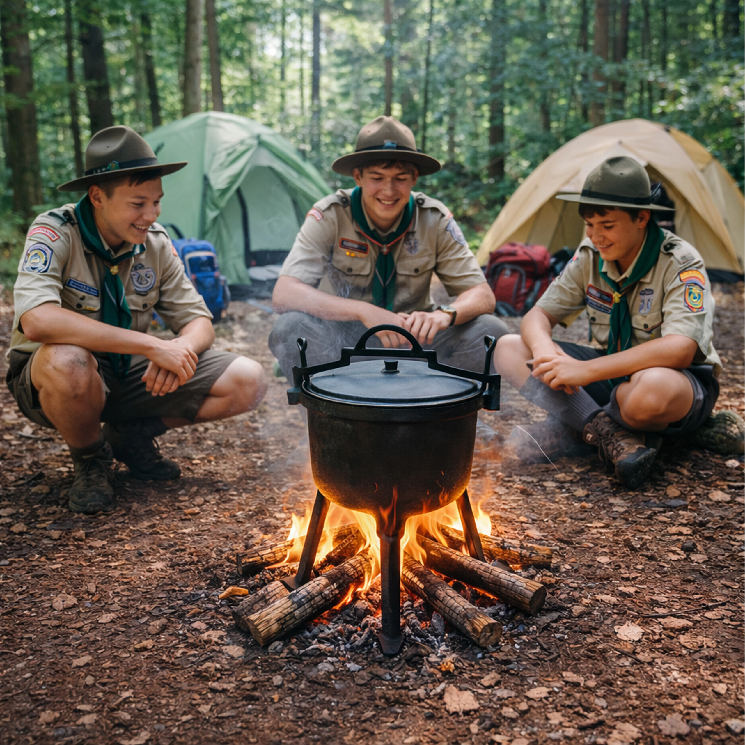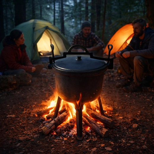 Zintegrowana trójnoga pewnie utrzymuje kociołek nad płomieniami, dzięki czemu gotowanie jest bezpieczne i równomierne nawet w plenerze.