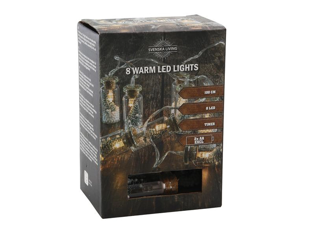 Elegancki łańcuch świetlny z buteleczkami i choinką rozświetli Twój dom przez cały adwent i resztę roku. Oferuje ciepłe białe światło, 8 diod LED, praktyczny timer 6/18 h oraz zasilanie bateryjne 2× AA dla wygodnego i bezpiecznego użytkowania wewnątrz pomieszczeń.