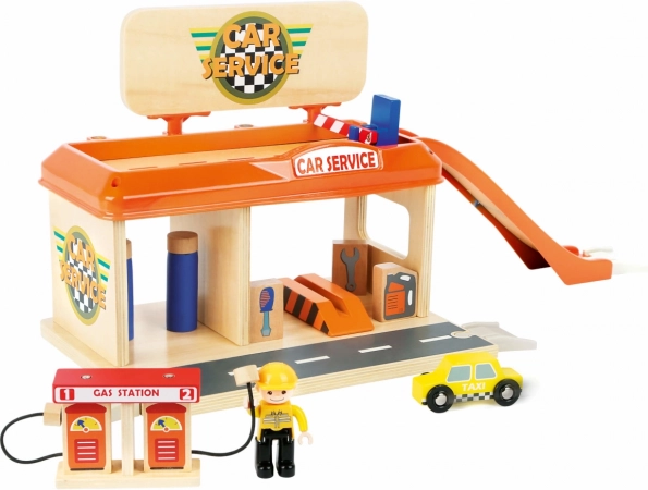 Ta drewniana zabawka jest idealna dla małych miłośników motoryzacji. Warsztat i stacja benzynowa zapewniają dwupoziomową zabawę i oferują jeszcze więcej przestrzeni do odkrywania. Dzieci pokochają realistyczne elementy, w tym rampę i parking zabezpieczony szlabanem.