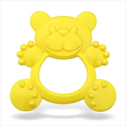 Żółty silikonowy gryzak z kółkiem łatwo się trzyma i jest idealny do delikatnego gryzienia oraz zabawy.