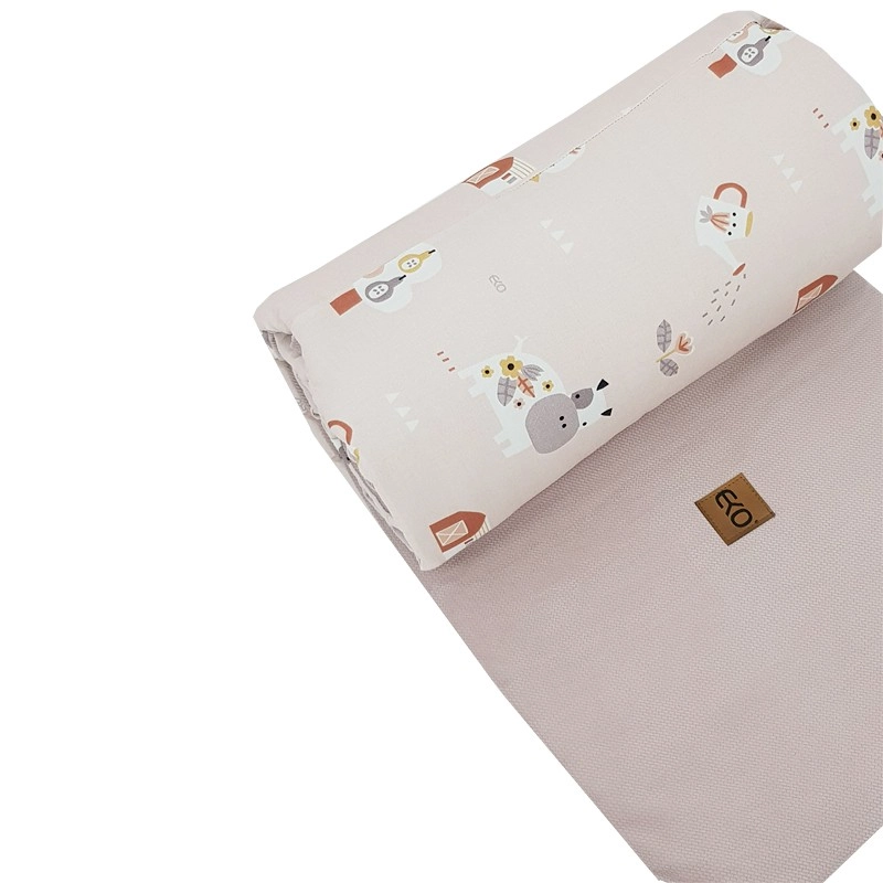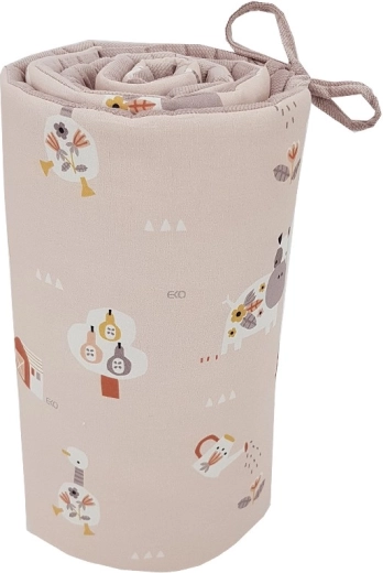 Praktyczne wiązanie na sznurki umożliwia łatwe i stabilne przymocowanie do większości standardowych łóżeczek. Wymiar 180 × 35 cm pokrywa dłuższy bok i część krótszego boku łóżeczka lub trzy krótsze odcinki według potrzeb. Delikatny pudroworóżowy odcień i motywy My Farm pięknie komponują się z innym wyposażeniem pokoju dziecięcego.