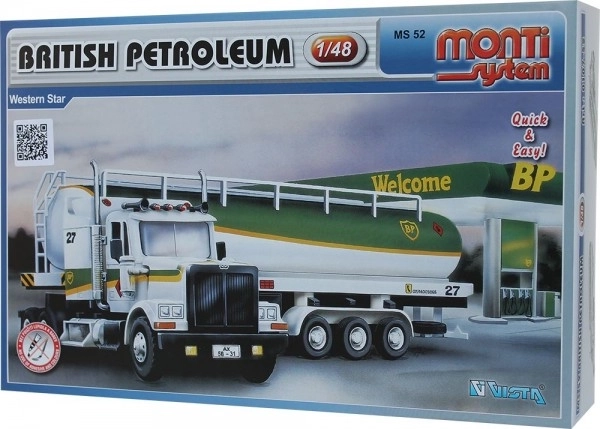 Zbuduj stylowy model BRITISH PETROLEUM w skali 1:48 od MONTI SYSTEM – łatwy zestaw bez kleju i bez malowania, idealny dla dzieci od 8 lat oraz początkujących modelarzy.