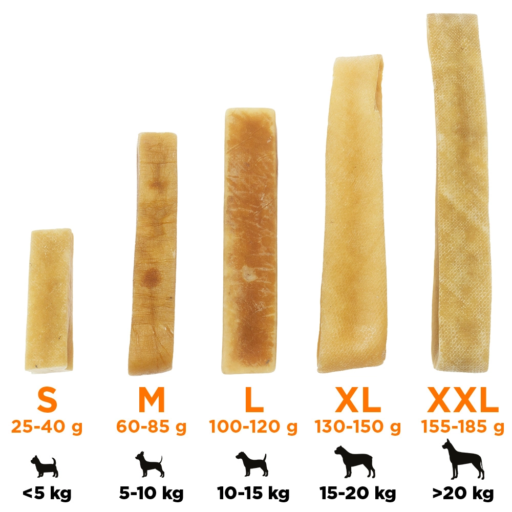 Receptura opiera się na 99,99% mleka z dodatkiem siemienia lnianego i minimalną ilością soli. Przysmak jest bez konserwantów, bez glutenu i bez laktozy, zawiera cenne minerały i witaminy (wapń, fosfor, witaminy A, D, E itd.). Odpowiedni dla psów wszystkich ras i rozmiarów; wariant XXL jest idealny dla dużych i silnych żuwaczy.