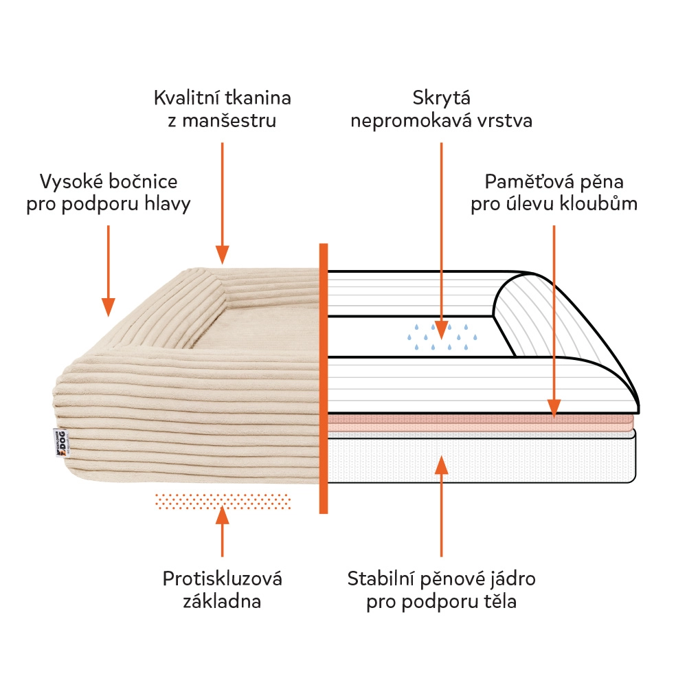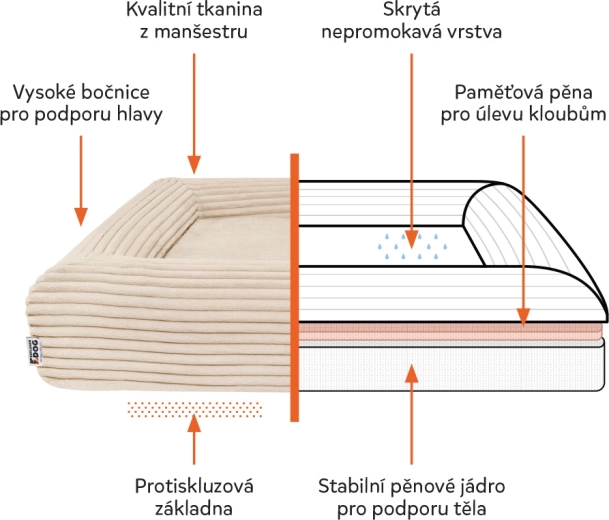 Wodoodporna wewnętrzna warstwa chroni rdzeń przed wilgocią, a antypoślizgowy spód utrzymuje legowisko na miejscu nawet na gładkich podłogach.