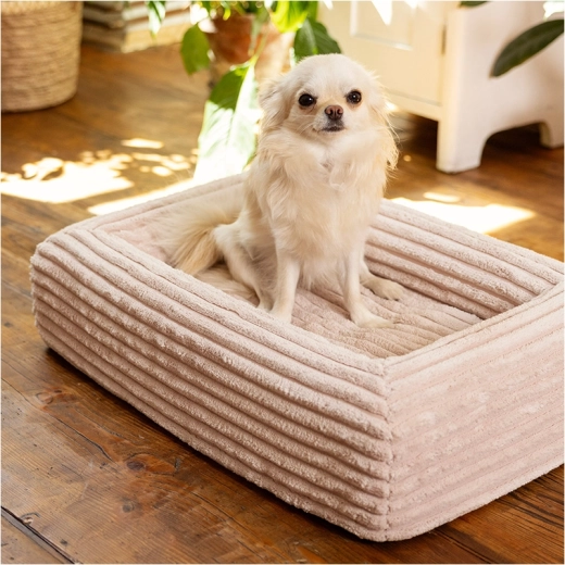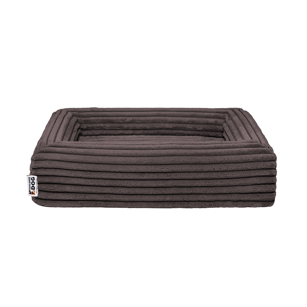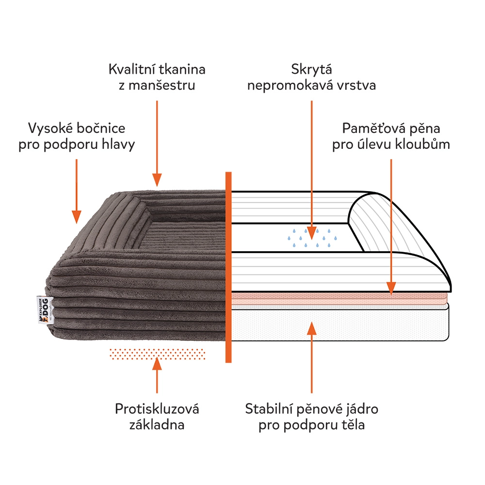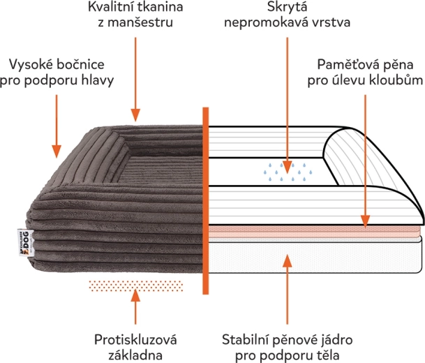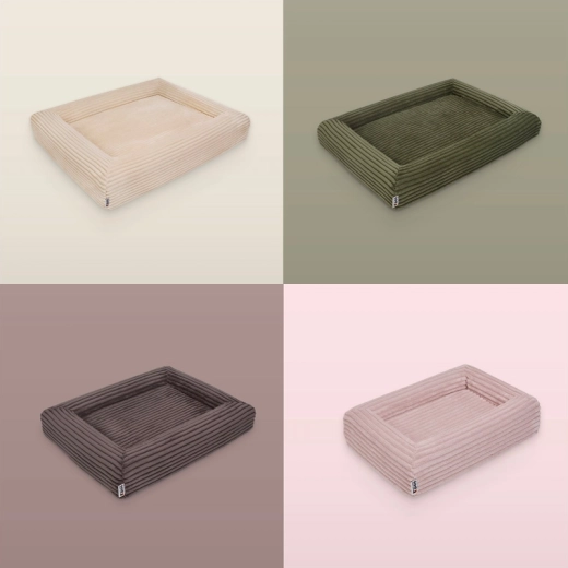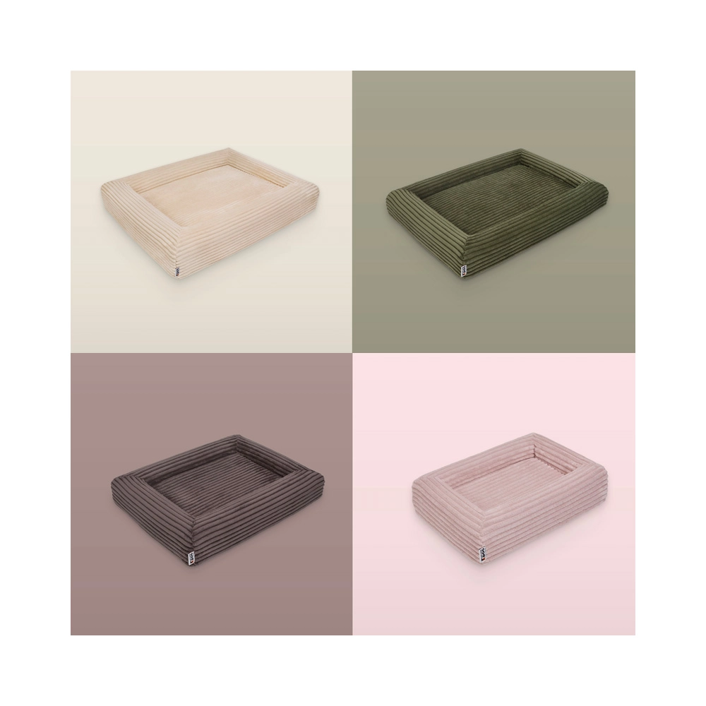 Pokrowiec z miękkiego sztruksu (100% poliester) z certyfikatem OEKO-TEX Standard 100 jest trwały, szybko schnie i mniej pochłania zapachy. Dzięki zamkom YKK łatwo go zdjąć i wyprać w pralce w 30 °C. Wodoodporna warstwa wewnętrzna chroni rdzeń piankowy przed wilgocią i zabrudzeniami, a antypoślizgowa spodnia strona utrzymuje legowisko stabilnie nawet na gładkich podłogach.