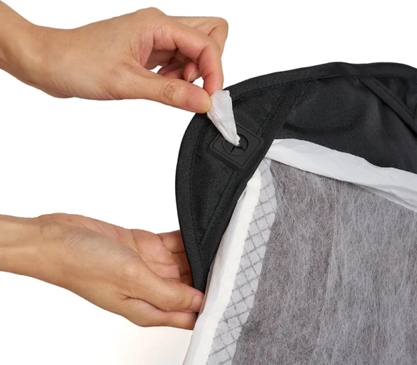 Dzięki amortyzowanym kołom i obrotowym przednim kółkom manewrowanie jest znakomite także na gorszej nawierzchni. Do dyspozycji jest duży dolny kosz z szybkim magnetycznym zamknięciem oraz praktyczny uchwyt na podkład chłonny. Po złożeniu wózek stoi samodzielnie, a dzięki kompaktowym wymiarom łatwo go przenosić i przechowywać.