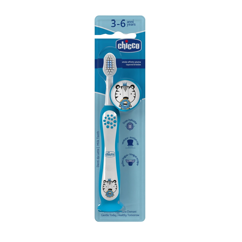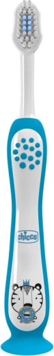 Dziecięca szczoteczka do zębów Chicco Tiger została zaprojektowana specjalnie dla dzieci w wieku 3–6 lat. Ma ekstra miękkie, stożkowe włókna do delikatnego czyszczenia zębów i dziąseł, ergonomiczną, antypoślizgową rączkę oraz wąską główkę dla łatwego dostępu do wszystkich miejsc w jamie ustnej. W zestawie znajduje się higieniczna osłonka, przyssawka do stabilnego odstawiania oraz wskaznik prawidłowej ilości pasty pośrodku główki.