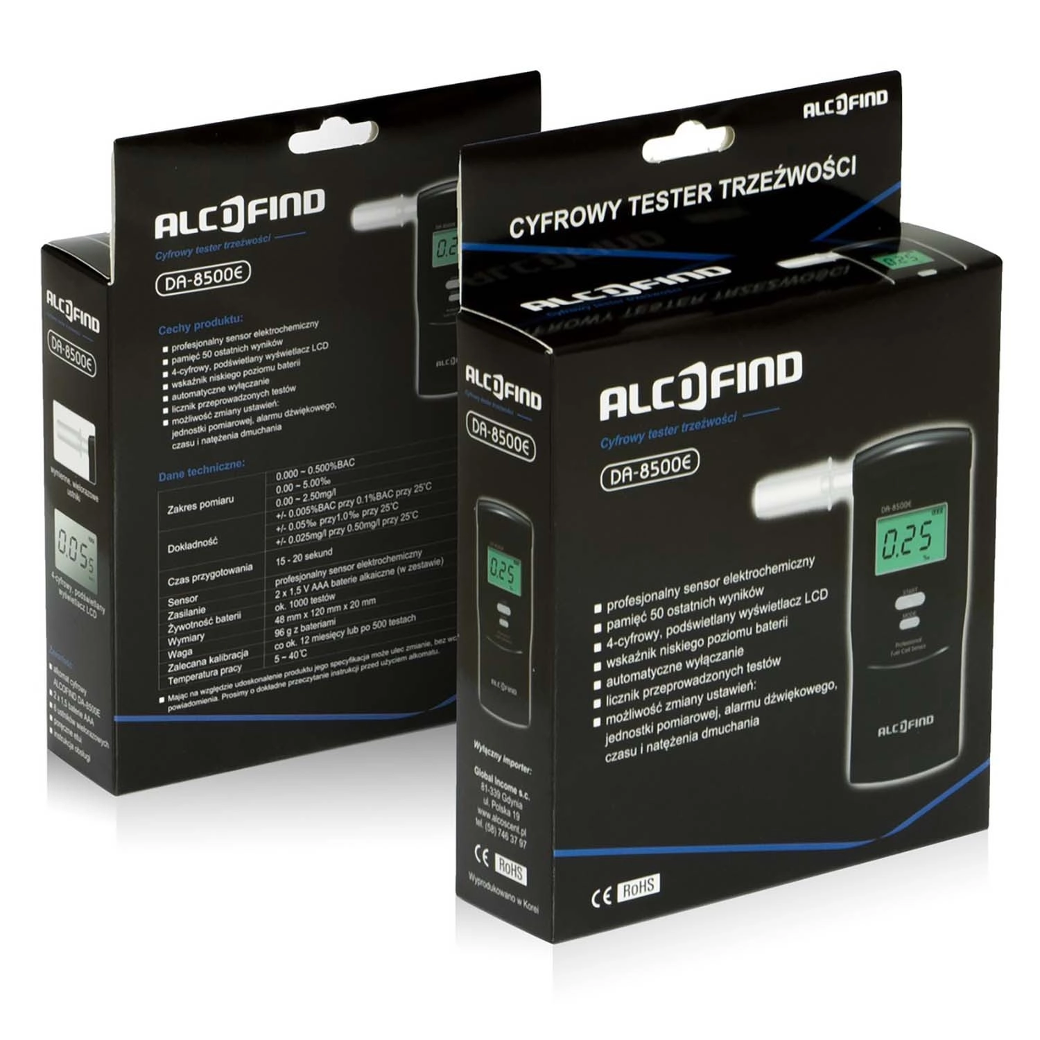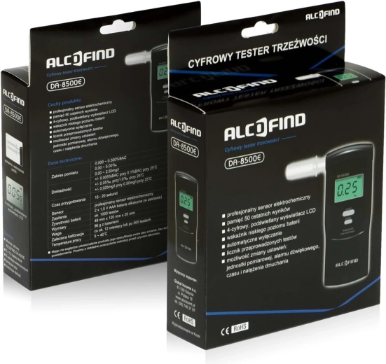 - Alkomat DA-8500E, etui, 2× AAA, 6× wielorazowy ustnik, 100× jednorazowy ustnik, instrukcja PL, opakowanie prezentowe, karta gwarancyjna, bezpłatna kalibracja do 12 miesięcy