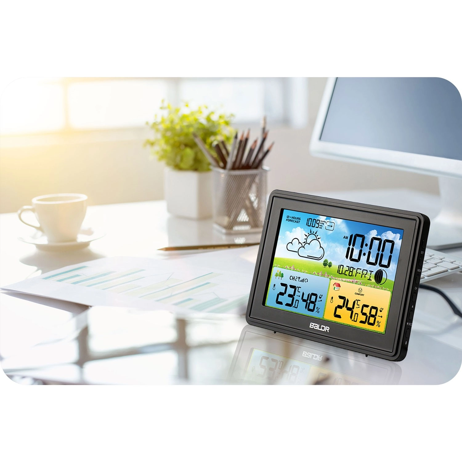 Bezprzewodowy czujnik zewnętrzny (zasięg do 60 m) przesyła aktualne wartości, które wyświetlane są obok danych z czujników wewnętrznych. Przejrzysty kolorowy LCD z 3 poziomami podświetlenia (100%, 60%, 5%) lub całkowicie bez podświetlenia zapewnia wygodny odczyt także w nocy. Nie brakuje wskazania komfortu, faz Księżyca, budzika i funkcji drzemki, a także wskaźnika poziomu baterii dla stacji i czujnika.