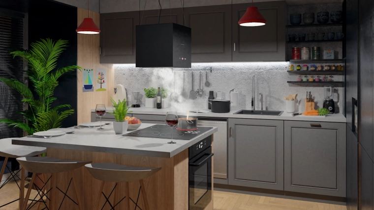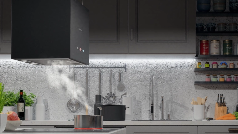 - Nowoczesny wygląd do kuchni z wyspą – kompaktowa, 40-centymetrowa kostka zawieszana pod sufitem.