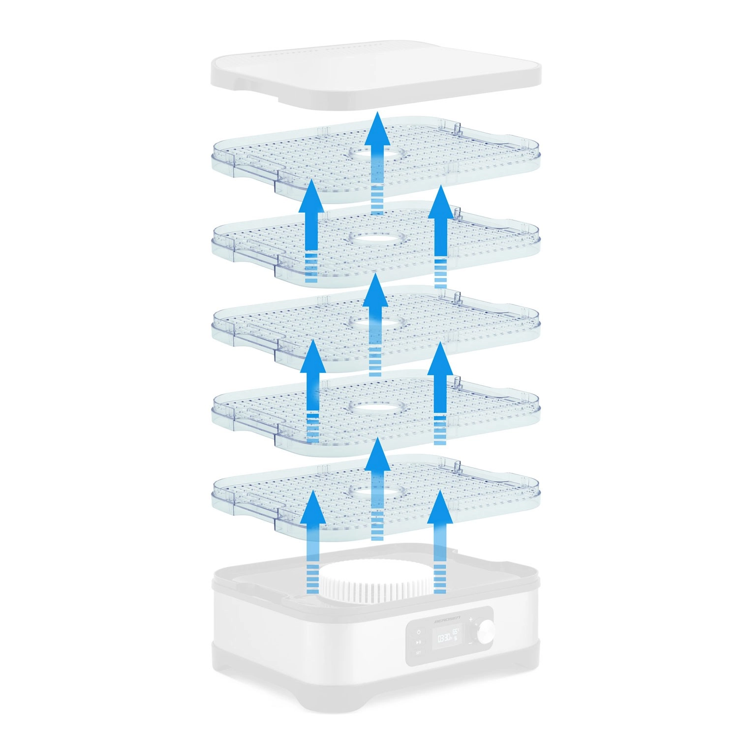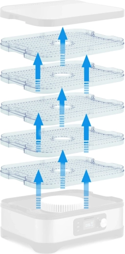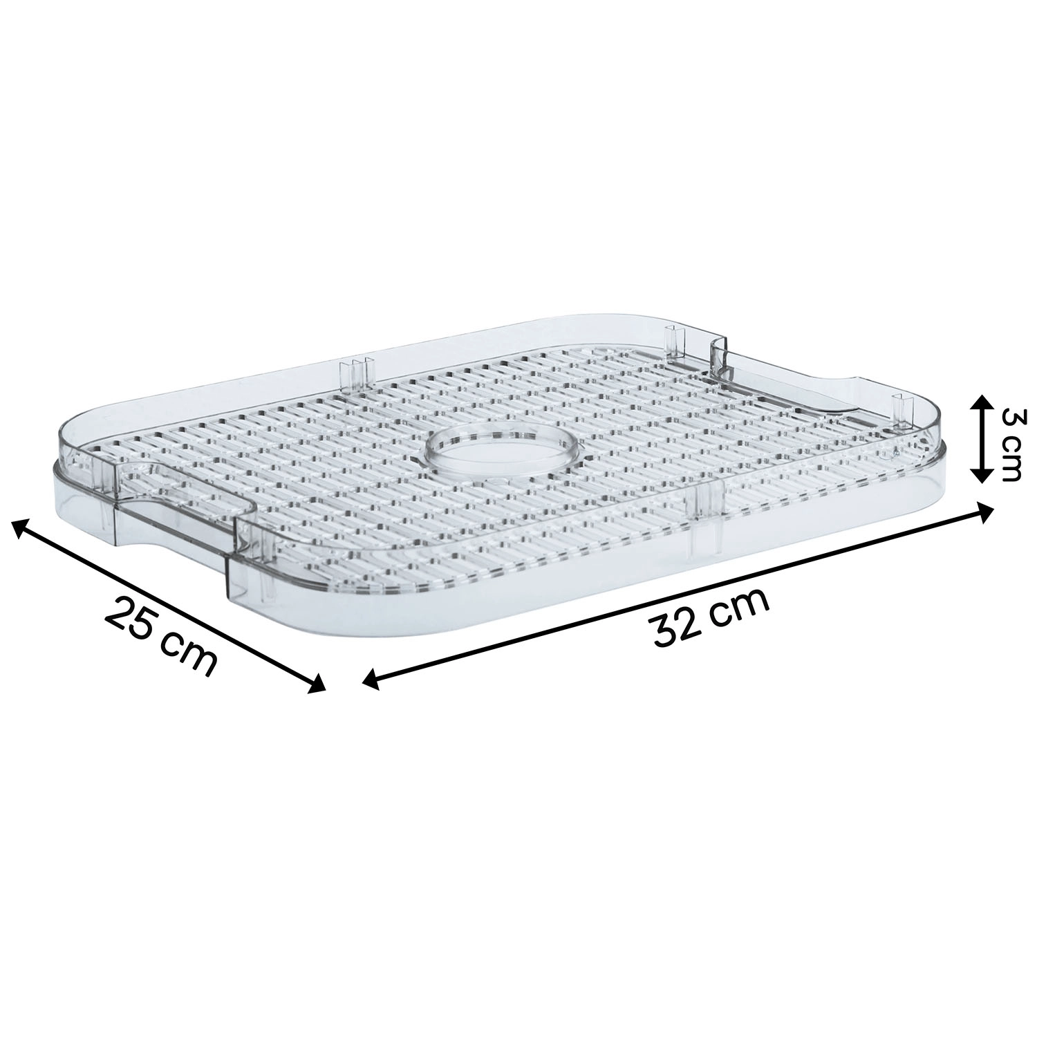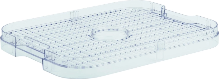 Przezroczysta perforowana taca łatwo wsuwa się jako kolejna półka i natychmiast powiększa powierzchnię suszenia dla większej ilości produktów jednocześnie.
