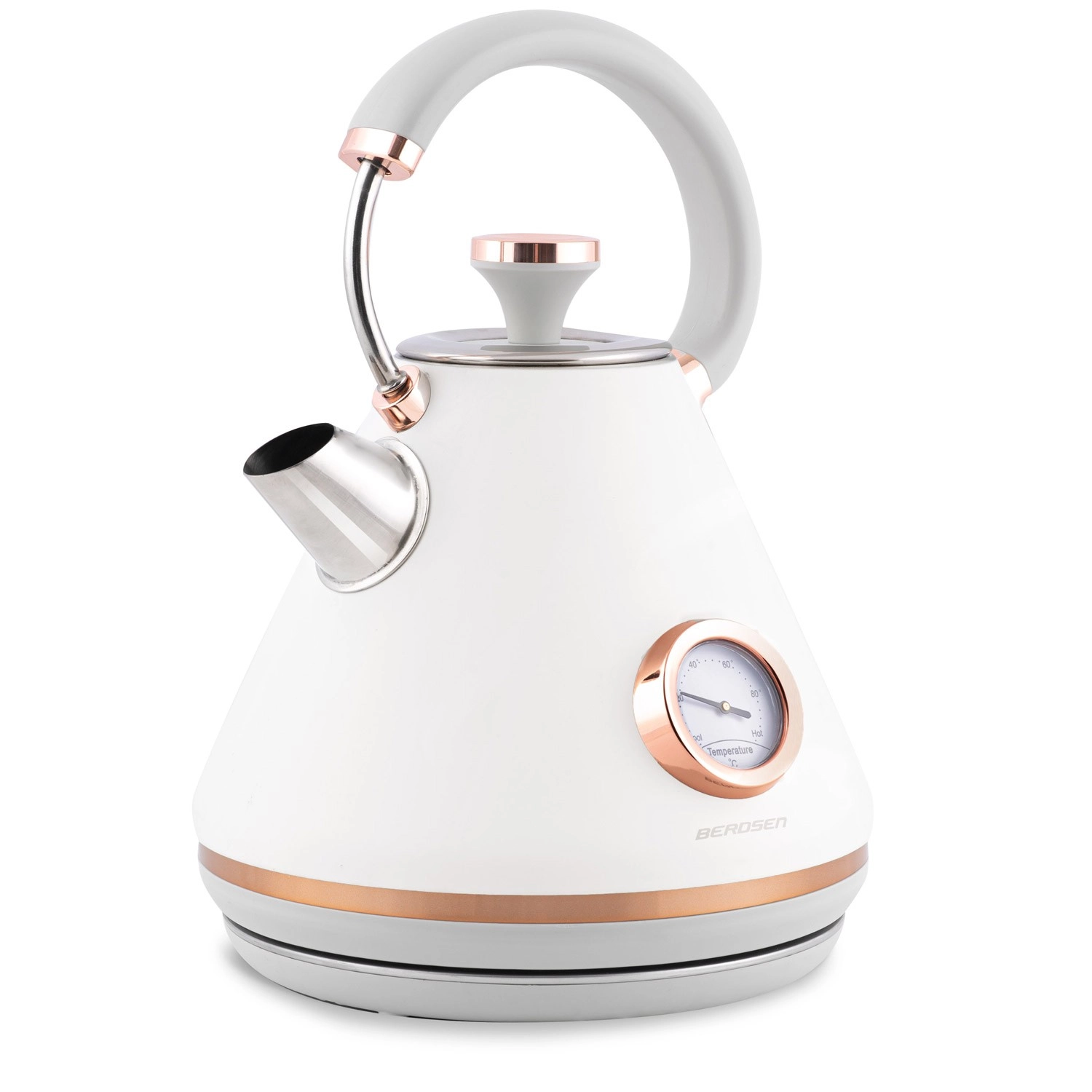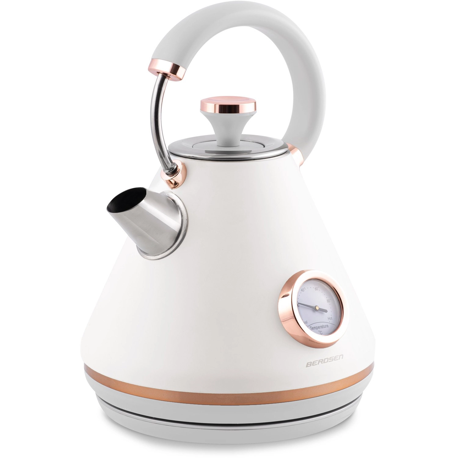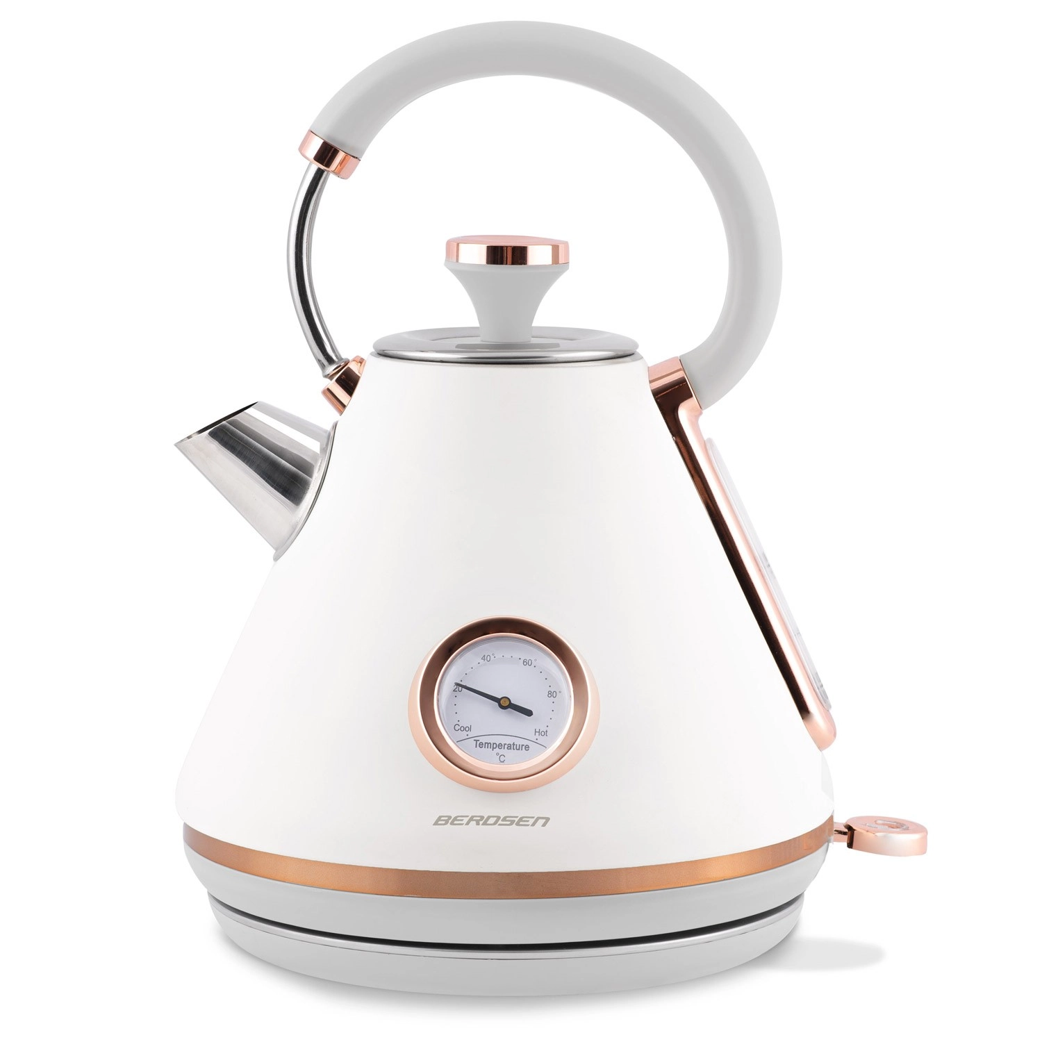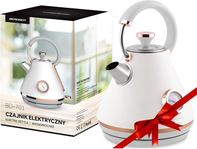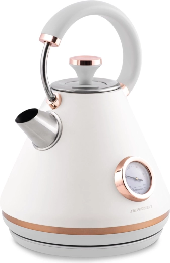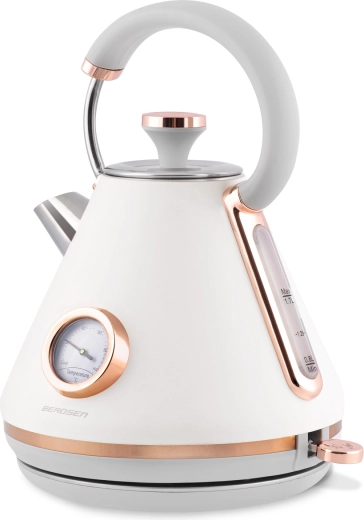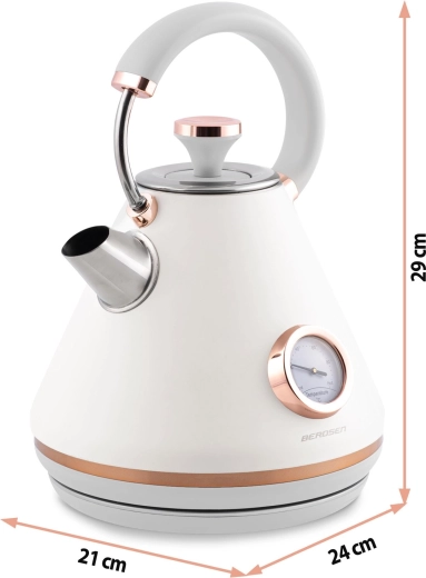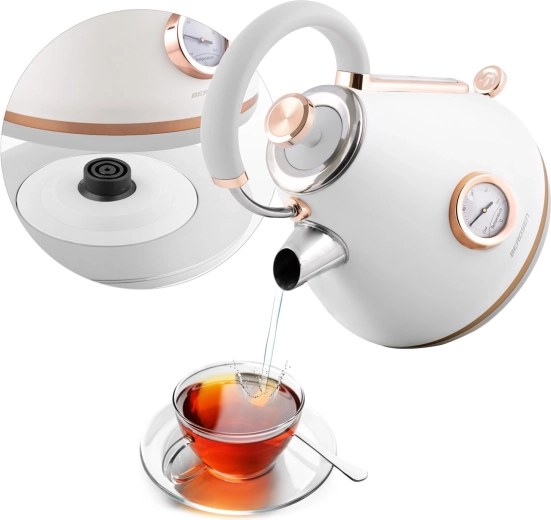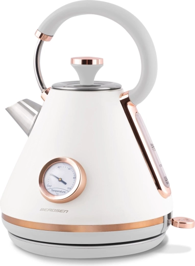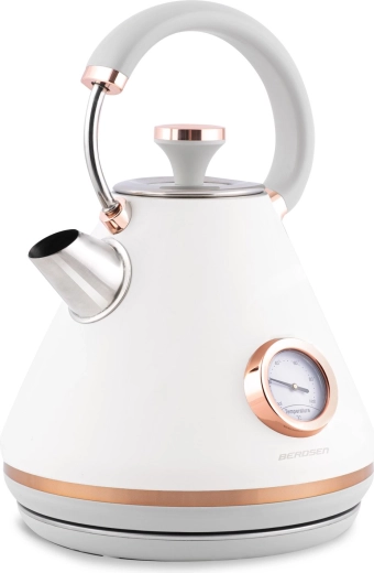 Stylowy czajnik elektryczny BERDSEN w stylu retro o pojemności 1,7 l zapewnia szybkie podgrzewanie wody oraz precyzyjne monitorowanie temperatury dzięki wbudowanemu termometrowi. Oferuje metalowe korpus z matowym wykończeniem, obrotową podstawę 360°, podświetlany włącznik, wyjmowany metalowy filtr antyosadowy oraz ergonomiczny, nie nagrzewający się uchwyt dla bezpiecznego i wygodnego nalewania.