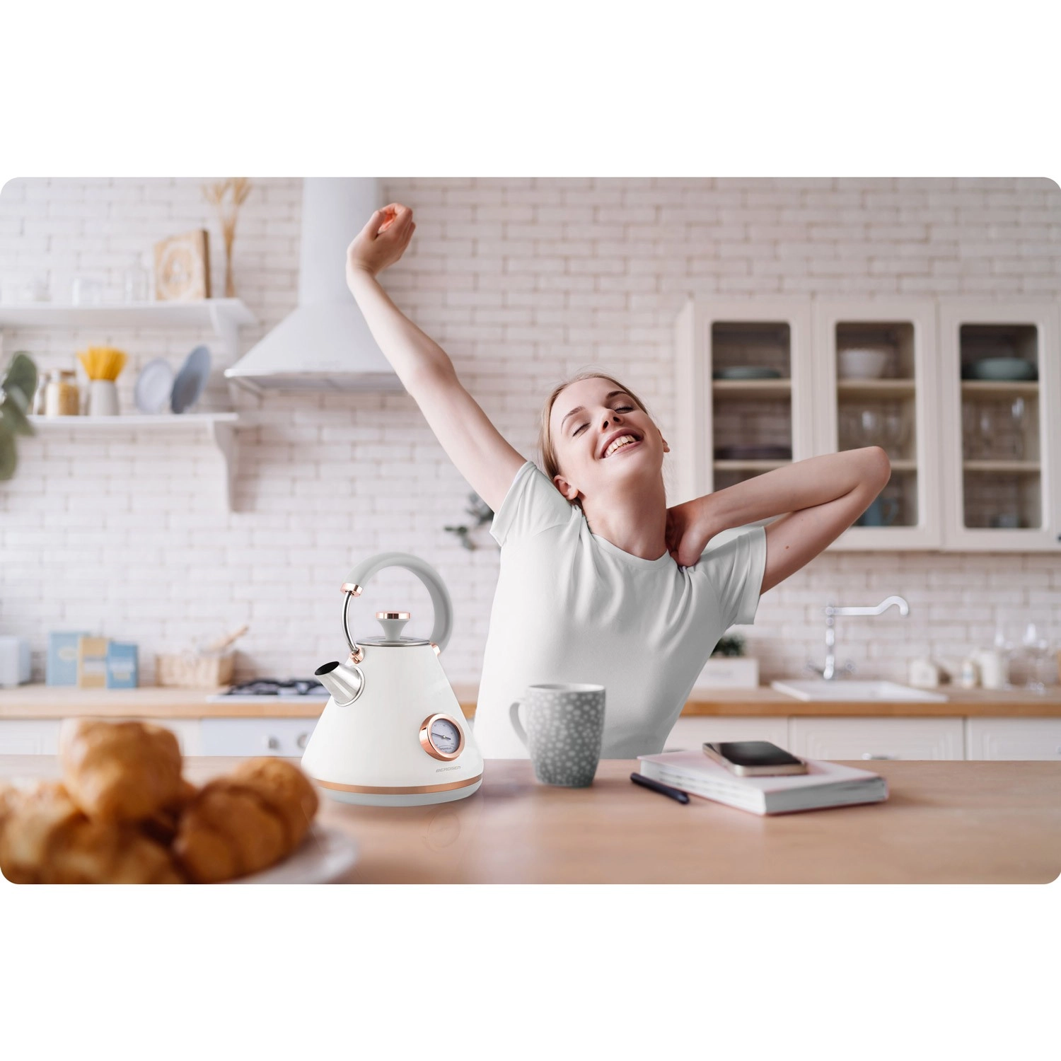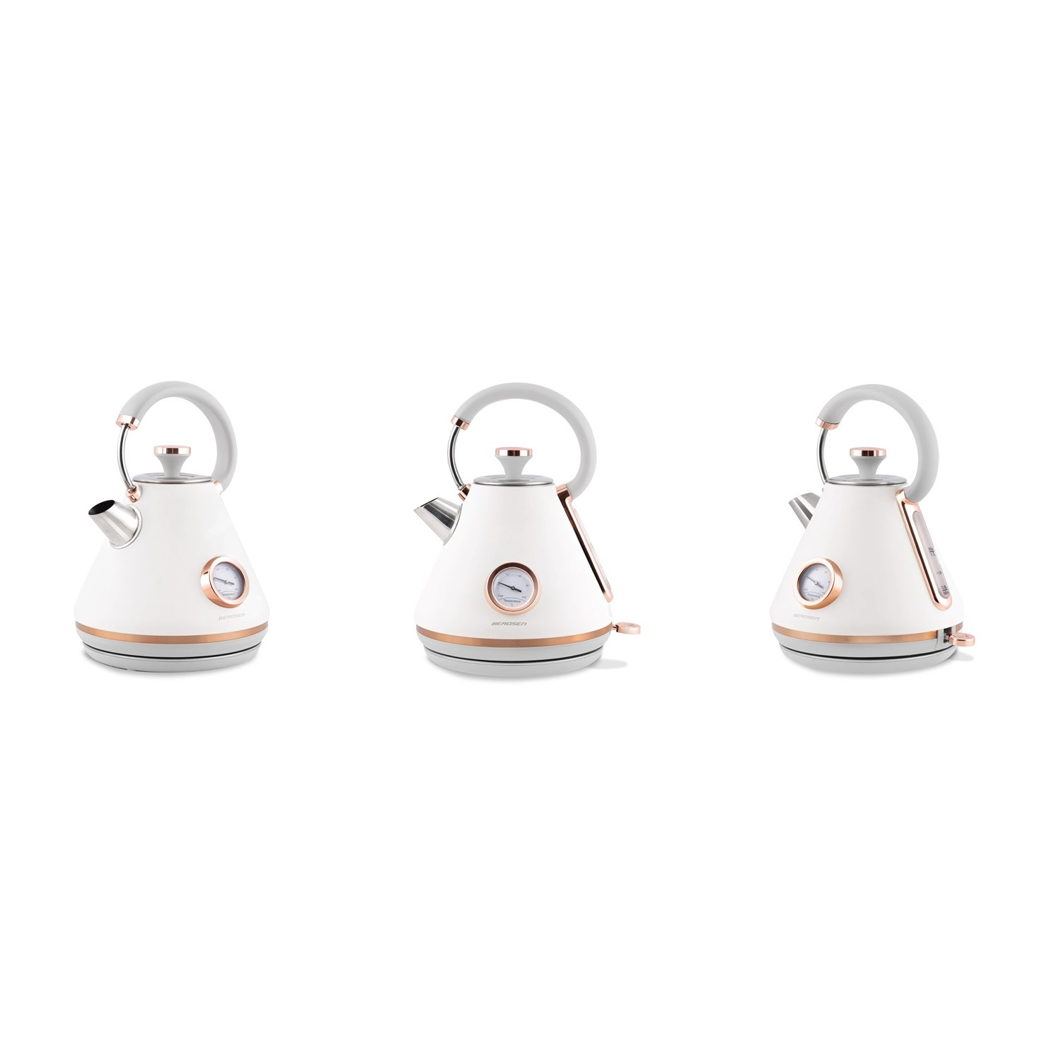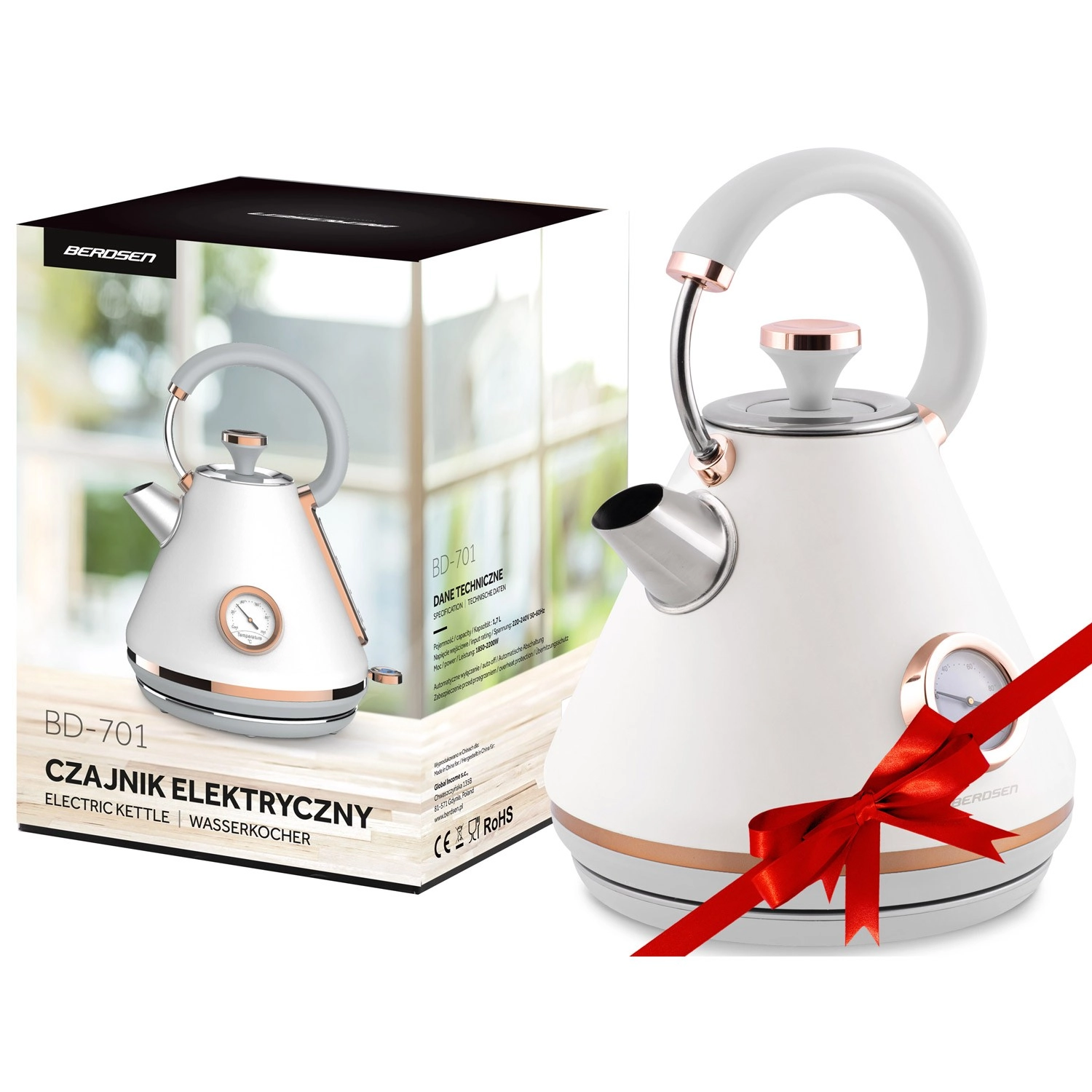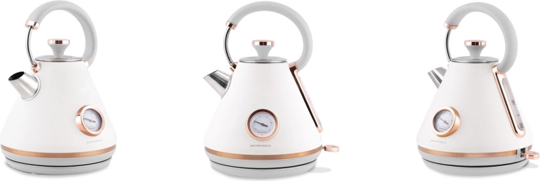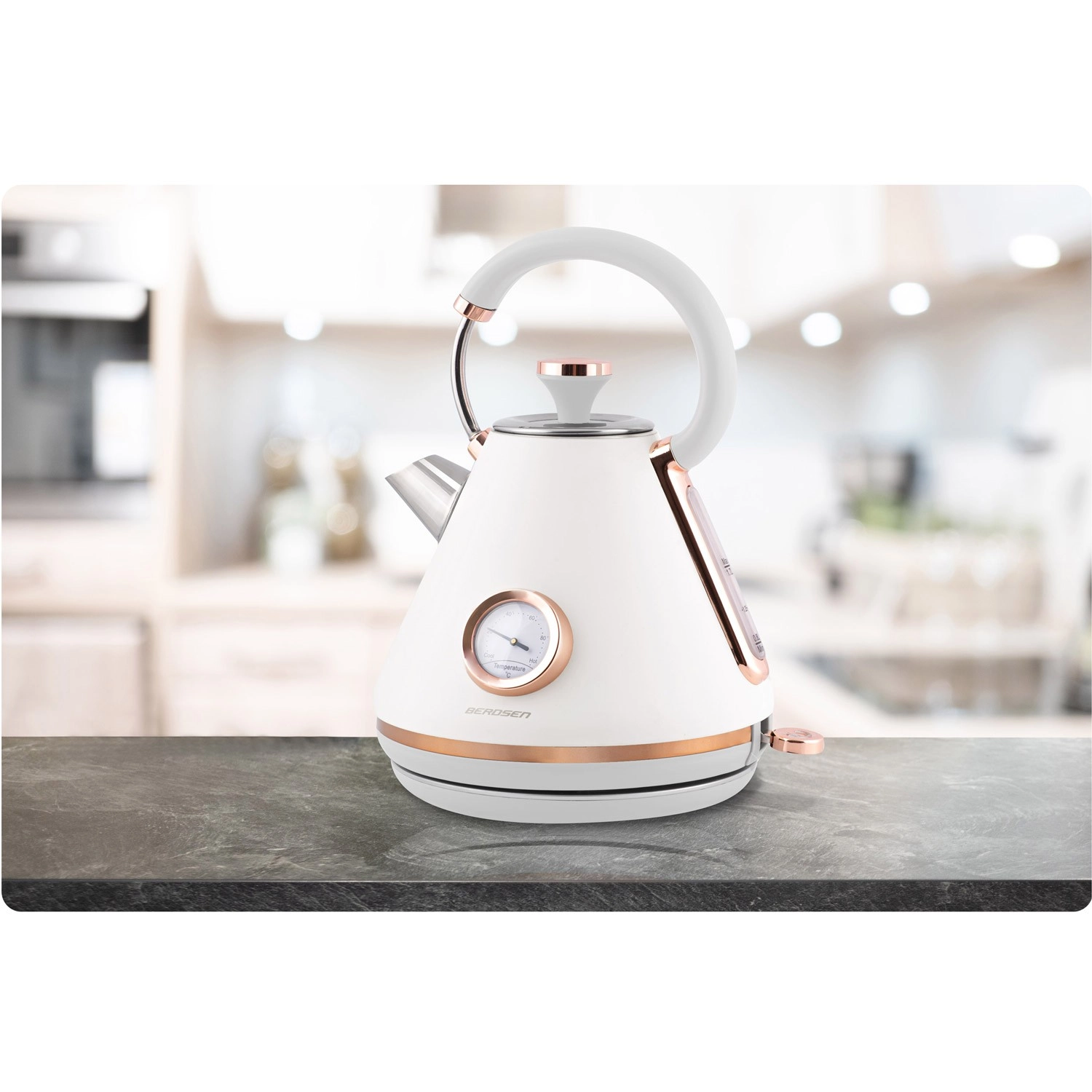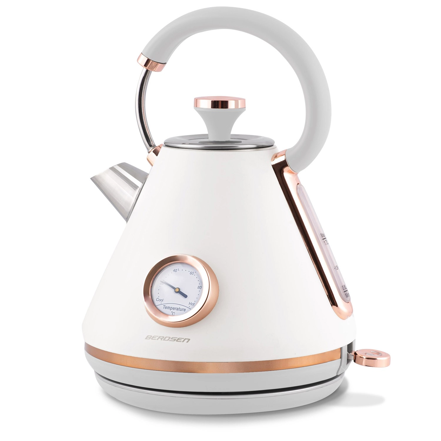 Stylowy czajnik elektryczny BERDSEN w stylu retro o pojemności 1,7 l zapewnia szybkie podgrzewanie wody oraz precyzyjne monitorowanie temperatury dzięki wbudowanemu termometrowi. Oferuje metalowe korpus z matowym wykończeniem, obrotową podstawę 360°, podświetlany włącznik, wyjmowany metalowy filtr antyosadowy oraz ergonomiczny, nie nagrzewający się uchwyt dla bezpiecznego i wygodnego nalewania.