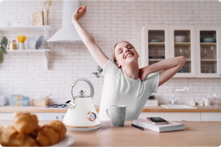 Postaw czajnik z dowolnej strony – odpowiedni dla prawo- i leworęcznych. Po zagotowaniu po prostu podnieś i nalewaj bez ograniczeń przewodem.