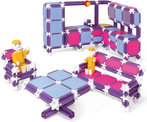 Zestaw SEVA RODINA – Mieszkanie oferuje wiele możliwości dla małych konstruktorek i konstruktorów. Dzięki połączeniu fioletu, różu i jasnego błękitu powstają oryginalne modele, które ucieszą każde dziecko. Złóż wygodne „lotnisko” – szerokie łóżko, nowoczesną narożną zabudowę kuchenną z zlewem i wbudowaną lodówką, kącik jadalniany, sofę, półki, szafki oraz poręczne regały.