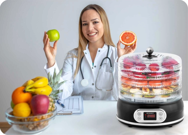 Przygotowuj zdrowe i pyszne przekąski – od chrupiących krążków jabłka, przez suszone zioła, po domowe jerky. Suszarka Berdsen z elektronicznym sterowaniem i czytelnym wyświetlaczem gwarantuje precyzyjne ustawienie czasu i temperatury. Obieg termiczny zapewnia równomierny przepływ ciepłego powietrza, dzięki czemu plastry suszą się efektywnie bez przypiekania.