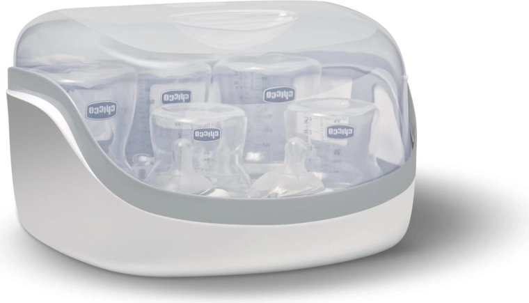 Szybka i bezpieczna sterylizacja butelek i akcesoriów dla niemowląt w kilka minut bezpośrednio w kuchence mikrofalowej. Ten kompaktowy sterylizator CHICCO mieści do 5 butelek i usuwa aż 99,9% bakterii bez chemii. Jest lekki i poręczny, idealny w domu i w podróży, a przy zamkniętej pokrywie utrzymuje zawartość sterylna nawet przez 24 godziny.