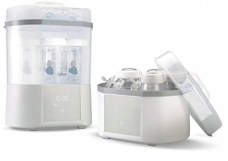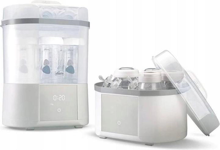 Nowoczesny elektryczny sterylizator parowy CHICCO zapewnia szybką i naturalną sterylizację w 5 minut, a dzięki zintegrowanej funkcji suszenia usuwa krople i pozostałą wilgoć. Mieści aż 6 butelek i akcesoriów, oferuje programy FULL i COMPACT, opóźniony start oraz zaawansowany filtr dla bezpiecznej pracy bez cząsteczek kurzu. Idealny wybór do higienicznego czyszczenia butelek, smoczków i innych akcesoriów.